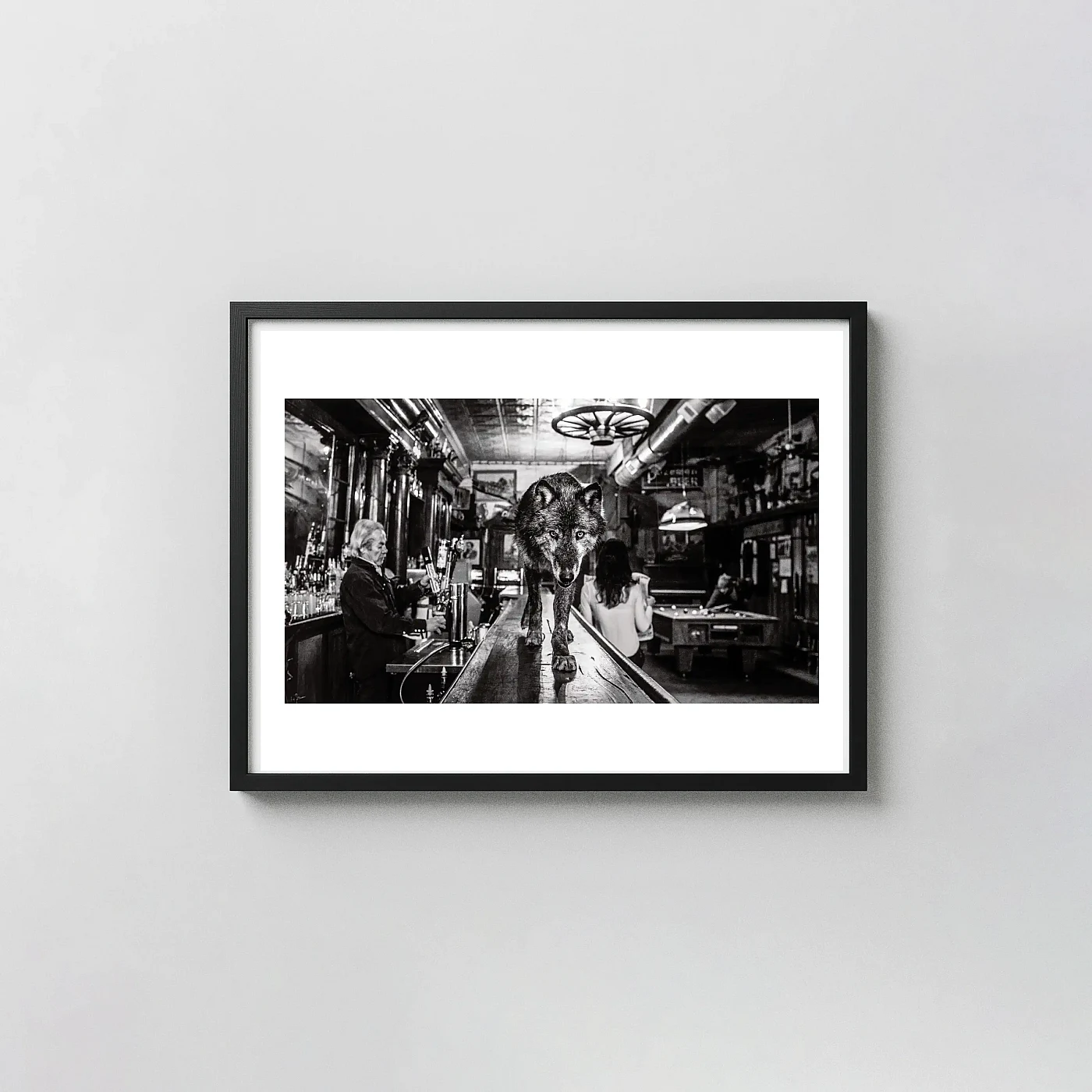 This striking poster captures the powerful narrative and technical mastery of photographer David Yarrow’s celebrated piece, “The Wolf of Main Street.” Rendered in dramatic, high-contrast black and white, the image depicts a magnificent wolf calmly traversing a vintage wooden bar counter inside a bustling American saloon. This juxtaposition of the wild animal in a human environment creates an immediately captivating piece of fine art photography, making it a spectacular focal point for any room. It’s an iconic piece sought after by art enthusiasts and collectors globally.
