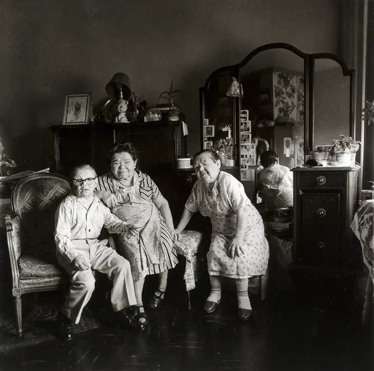 This striking poster features Diane Arbus’s captivating 1968 work, “Three People in a Living Room, N.Y.C.” Arbus, celebrated for her raw and intimate documentary style, captures a powerful moment of connection and vulnerability. The composition is classic Arbus—a close-up portrait of three individuals looking directly into the lens, situated within a richly detailed, slightly claustrophobic interior space. This black and white print is an essential piece for anyone appreciating the profound depth of mid-century American photography and the mastery of portraiture.