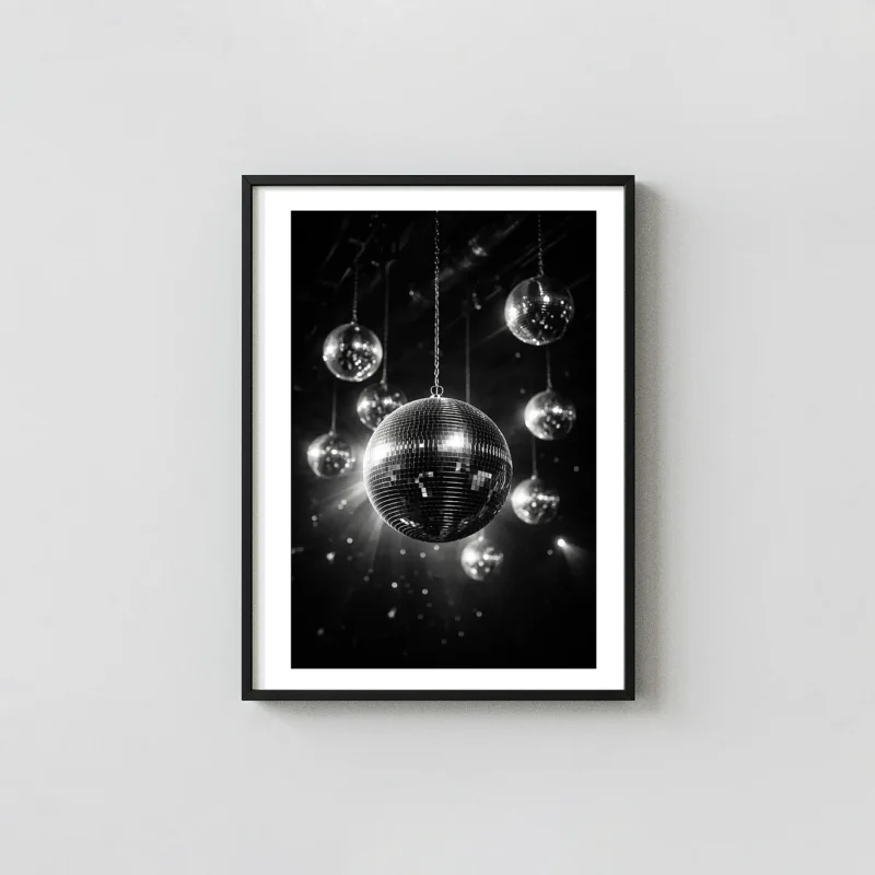 - Design & vibe: Vintage geometric photography in luminous black and white — retro, bold, and deeply stylish. The mirror ball as a subject gives this disco shining ball 70s print an almost abstract quality that works in contemporary minimalist spaces as naturally as it does in retro-styled rooms. Party disco globe black and white wall art has a universal visual language: it communicates fun, movement, and the specific joy of the dancefloor without needing any supporting context.
