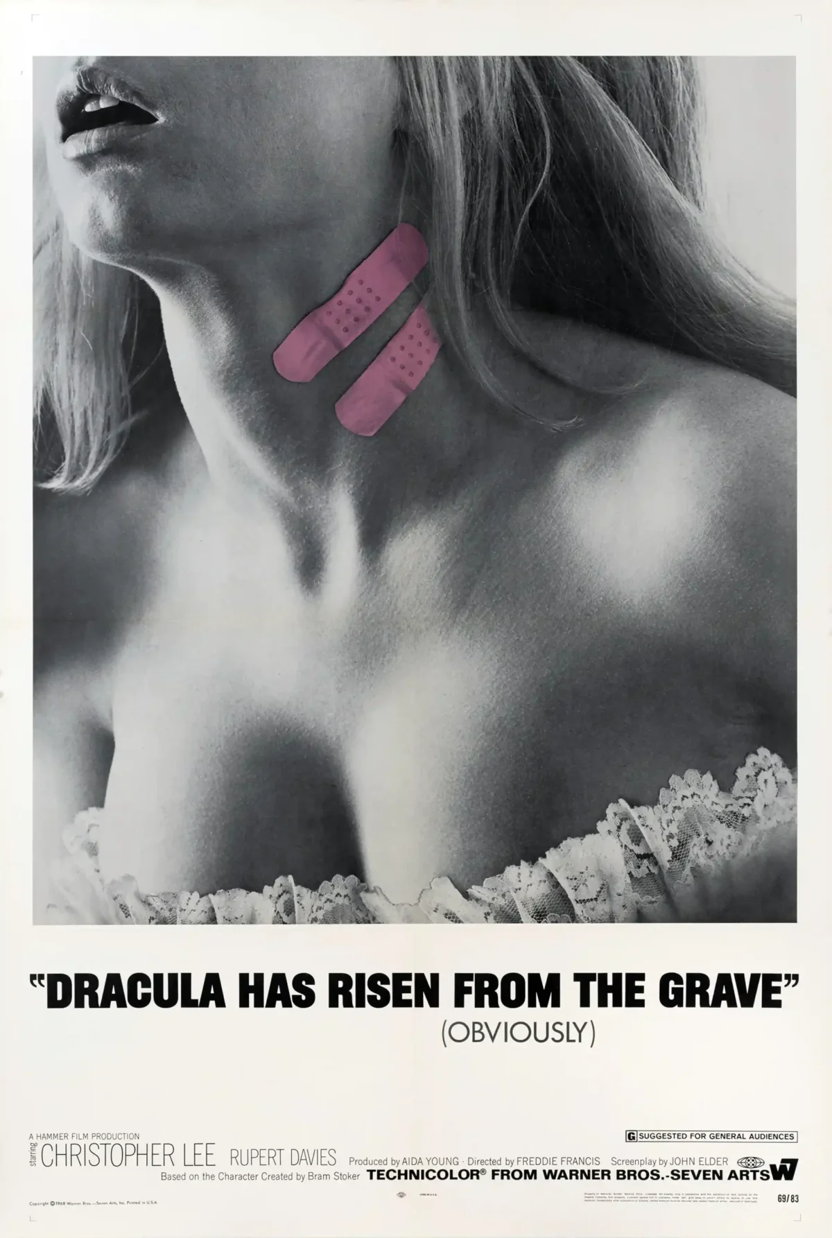 Capture the subtle horror and iconic style of Hammer Films with this official vintage poster for Dracula Has Risen From the Grave (1968), starring the legendary Christopher Lee. This highly sought-after artwork cleverly utilizes a striking, minimalist visual: a close-up of a woman’s neck in black and white, cheekily covered by two vibrant pink band-aids. The design’s witty implication — ‘Dracula Has Risen From the Grave (Obviously)’ — makes this piece a masterpiece of 1960s horror advertising and a standout piece of wall art for any serious film collector.