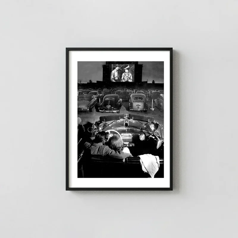 There’s something about this drive-in cinema print that doesn’t feel like decoration — it feels like memory. A young couple sits inside their car, the outdoor screen’s glow washing everything in high-contrast black and white, the grain doing the rest of the emotional work. This is a drive-in cinema print built entirely on mood: no color, no graphic design, just a single moment from a summer evening frozen in silver and shadow.