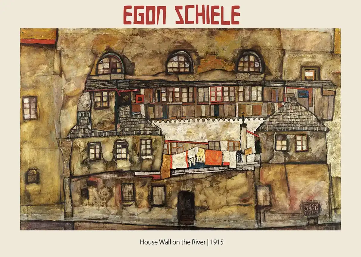 Immerse yourself in the gritty, soulful urban landscapes of Austrian Expressionist master Egon Schiele. This high-quality museum poster reproduces Schiele’s 1915 oil painting, House Wall on the River, a pivotal piece that highlights his distinctive approach to architecture and environment.