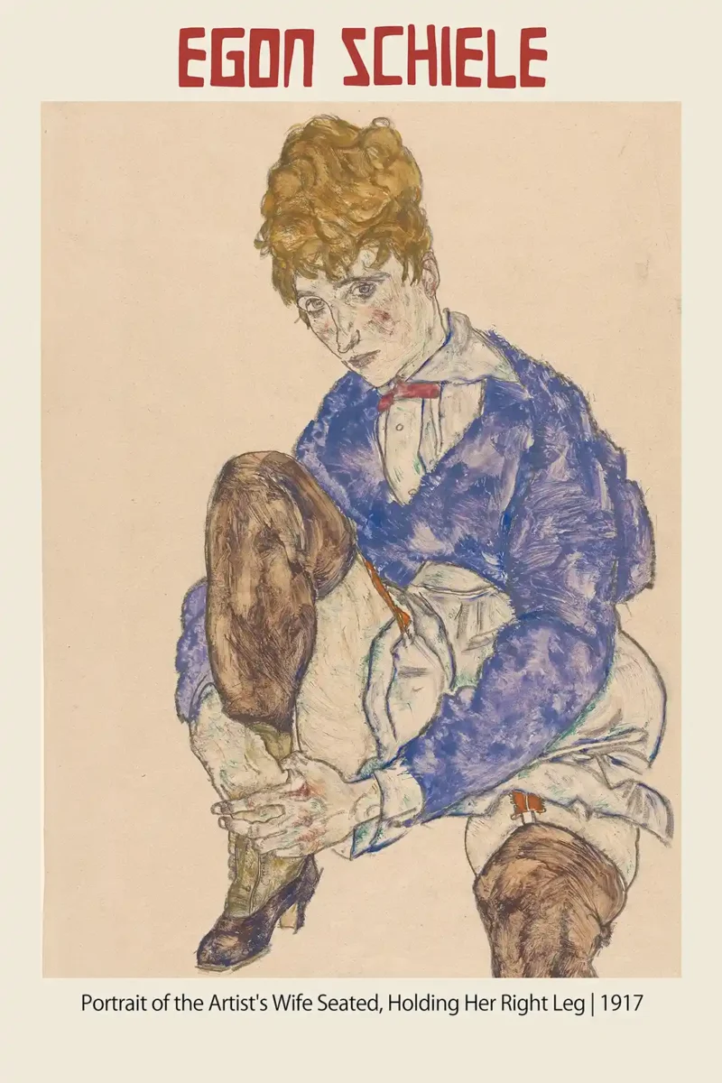 Bring the raw, emotional power of Austrian Expressionism into your space with this exquisite fine art poster featuring Egon Schiele’s 1917 masterwork, “Portrait of the Artist’s Wife Seated, Holding Her Right Leg.” Schiele, a key figure in early 20th-century art, captures his wife, Edith Schiele (née Harms), in a characteristically arresting and intimate pose. This piece, created just one year before his untimely death, demonstrates his mature style—combining bold, economical line work with washes of watercolor and gouache, notably the vibrant indigo blue of her jacket set against the naturalistic, brown tones of her stockings.