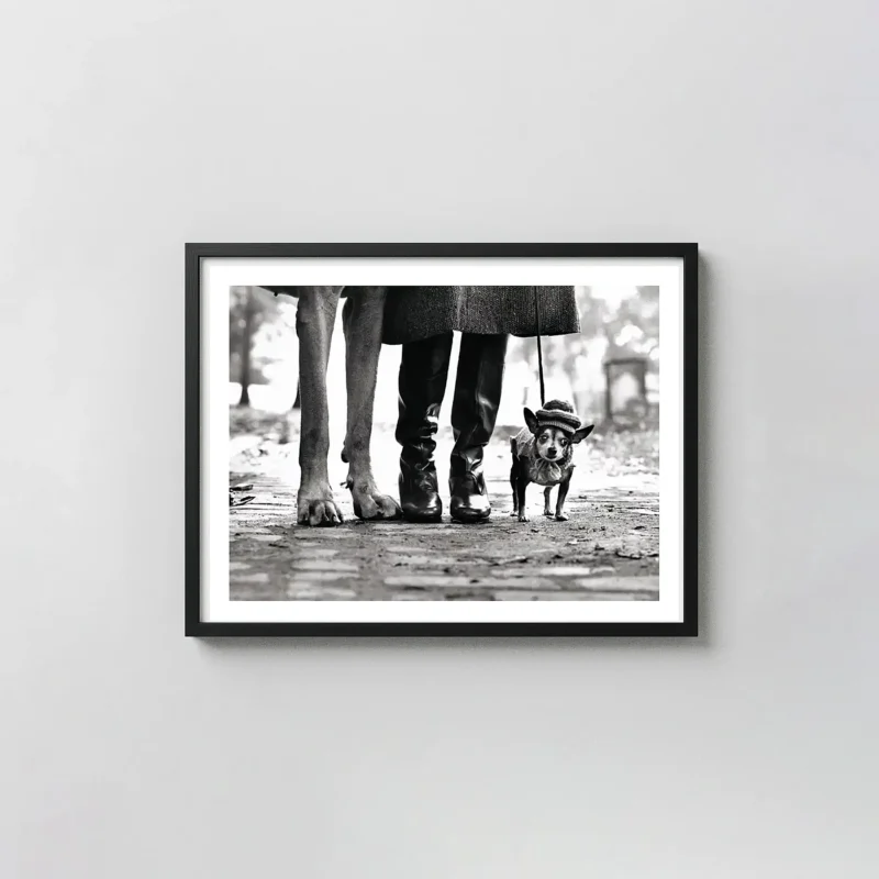 This striking piece is the renowned “Dog Legs” photograph taken by Elliott Erwitt in New York, 1974. A masterpiece of comedic timing and sophisticated composition, the image perfectly captures the absurd contrast between the immense legs of a Great Dane, the polished boots of its owner, and the tiny, bundled-up Chihuahua staring directly at the camera. This black and white print is a signature piece of Erwitt’s celebrated collection, capturing the humor and humanity found in everyday life. It serves as a sophisticated conversation starter and a true piece of modern photographic history, making it a must-have piece of wall art for collectors.
