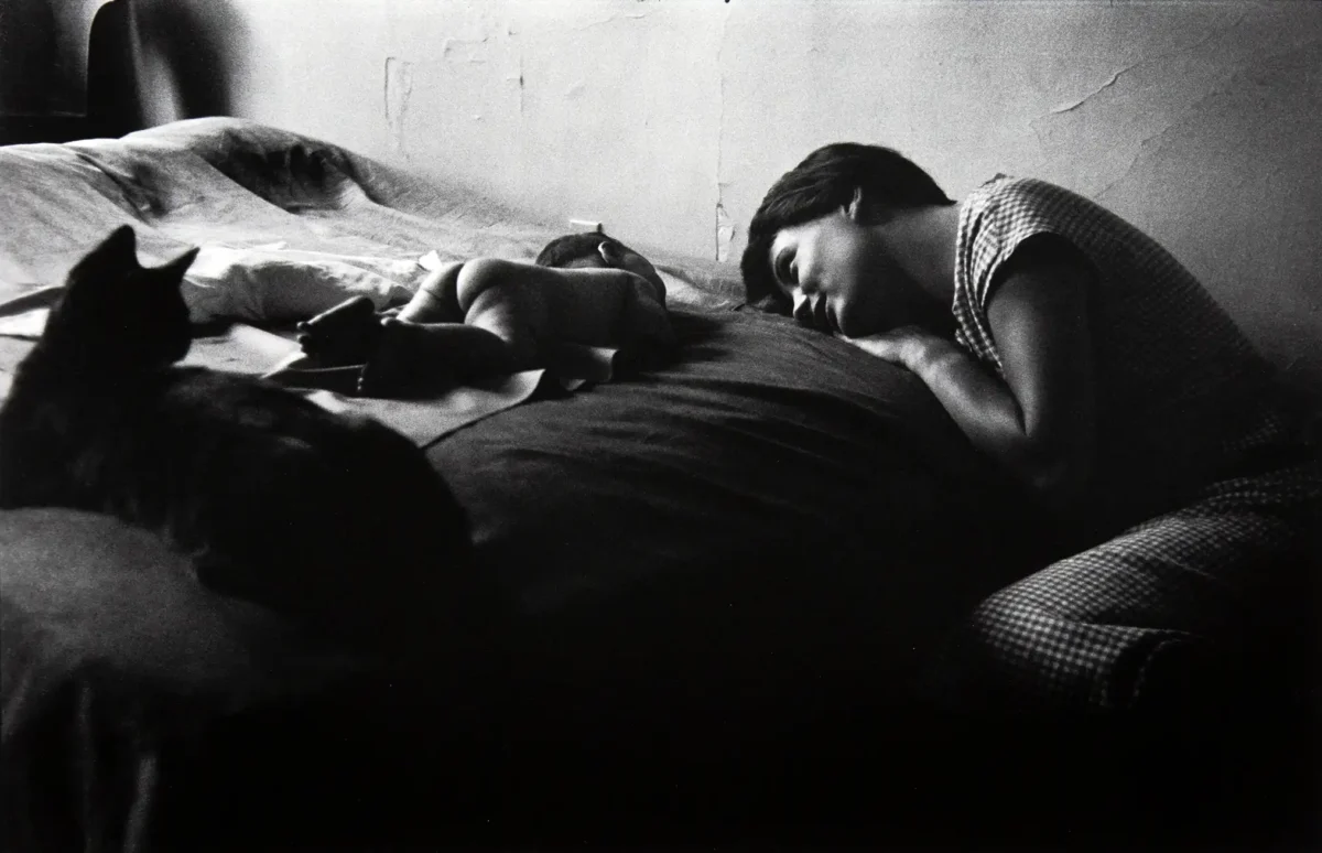 Capture the profound intimacy and humane observation of master photographer Elliott Erwitt with this iconic black and white print. Known for his candid, documentary style, Erwitt perfectly encapsulates the quiet, sometimes chaotic, beauty of domestic life. This stunning photograph features a mother resting alongside her baby on a bed, watched over by a silhouetted cat—a moment of serene co-existence beautifully rendered in high-contrast monochrome. This unique piece of wall art brings depth and narrative to any space, celebrating Erwitt’s genius for capturing genuine emotion.