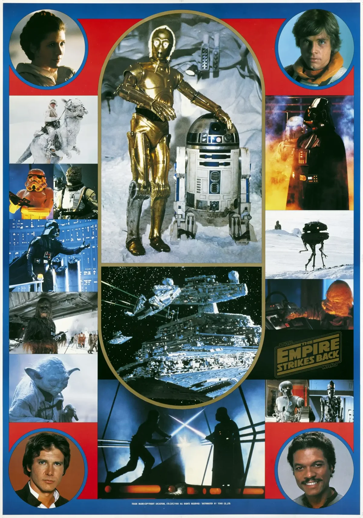 The Empire Strikes Back poster brings together the defining moments of the 1980 sequel in one bold, classic collage layout. As the second chapter in the original trilogy, Star Wars: The Empire Strikes Back deepened the saga with darker themes, emotional reveals, and some of the most iconic imagery in cinematic history.
