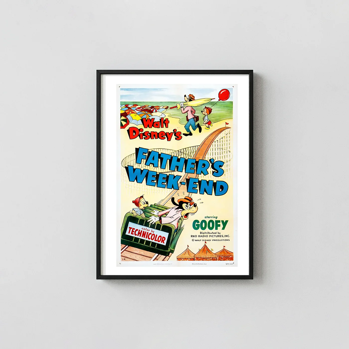 This “Father’s Week-End” poster is the ultimate gift for Disney collectors, animation buffs, or anyone who appreciates retro comedy and vintage art. Ideal for decorating a movie room, a child’s bedroom, or adding a touch of classic charm to your living room decor. Celebrate the timeless humor of Goofy and the special bond between father and son with this truly unique piece of Disney wall art.