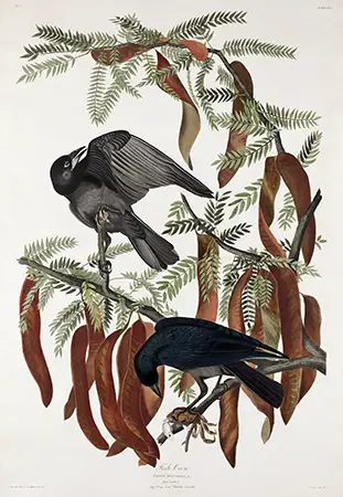 In this specific illustration, Audubon paired the subjects with the Gleditsia triacanthos, commonly known as the Honey Locust. The Fish Crow print illustrates the interaction between the birds and the tree’s distinctive, elongated seed pods. These pods are rendered in rich earthy ochres and deep sienna tones, providing a stark color contrast against the monochromatic feathers of the crows. The fine, feathery structure of the pinnate leaves adds a layer of intricate texture to the background, demonstrating the technical mastery of the original copperplate etching and aquatint process. This piece serves as a vital record of American natural history and remains a sought-after aesthetic for those valuing traditional scientific art.