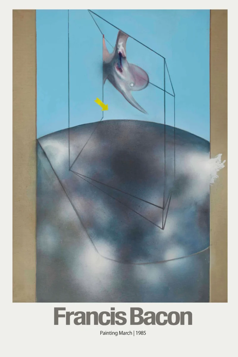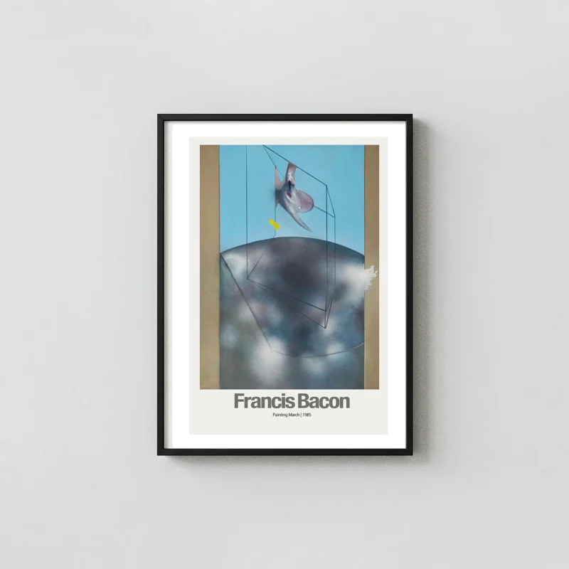 This striking poster features Francis Bacon’s powerful late-period work, “Painting March, 1985.” The artwork perfectly embodies Bacon’s signature style, showcasing a distorted, biomorphic figure isolated within the clean, architectural lines of his characteristic geometric cage. The unsettling form, set against a stark, light blue background and contrasted with a dark, diffused foreground, creates a potent sense of existential isolation and tension. This image is a monumental statement in Post-War modern art and a profound piece of art history.