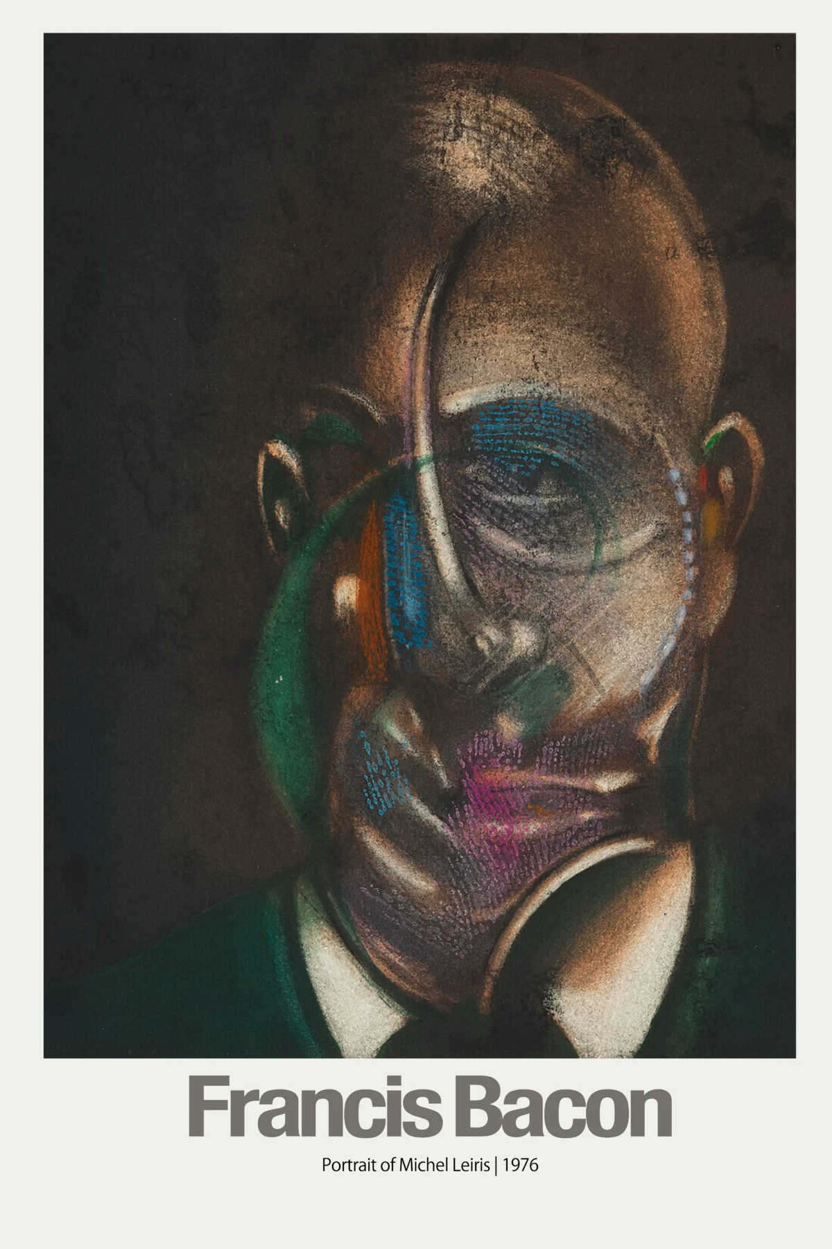 Capturing the raw intensity and psychological depth that define the artist’s legacy, this poster features Francis Bacon’s powerful ‘Portrait of Michel Leiris’ from 1976. This seminal piece of modern art showcases Bacon’s signature style of distorted figuration, presenting the subject’s face as simultaneously recognizable yet unsettlingly abstract. The dynamic brushwork, coupled with rich, dark tones punctuated by vivid smears of blue, green, and purple, makes this fine art poster an arresting focal point in any room. It is a perfect way to bring the challenging and iconic energy of post-war Expressionism into your contemporary wall decor.