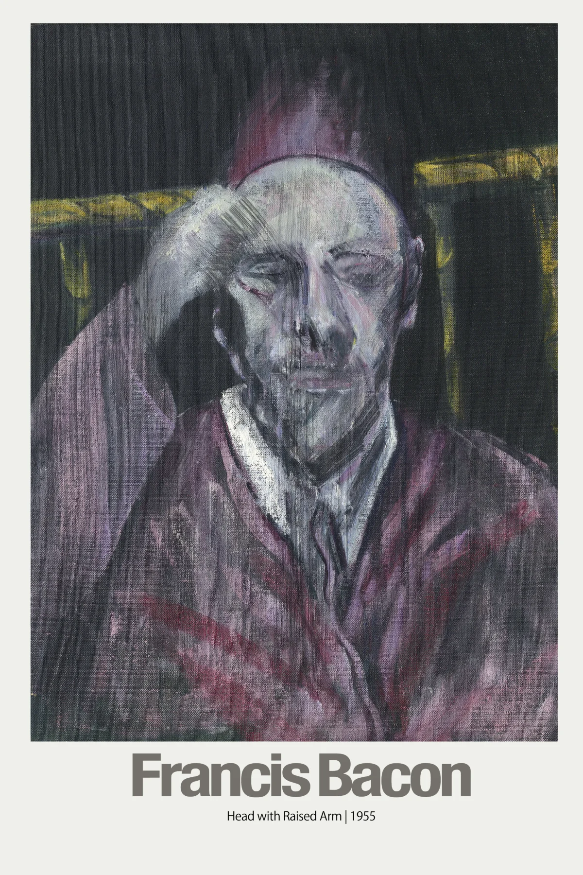 Capture the raw intensity and psychological depth of one of modern art’s most celebrated figures with this Francis Bacon “Head with Raised Arm” poster. Painted in 1955, this striking figurative work exemplifies Bacon’s distinctive style—a blend of expressionist distortion and visceral emotion. The subject, rendered in fractured brushstrokes and haunting muted colors, covers part of their face, creating a dramatic sense of anonymity and internal conflict. This print is a powerful statement piece for any serious art lover or collector fascinated by post-war European painting.