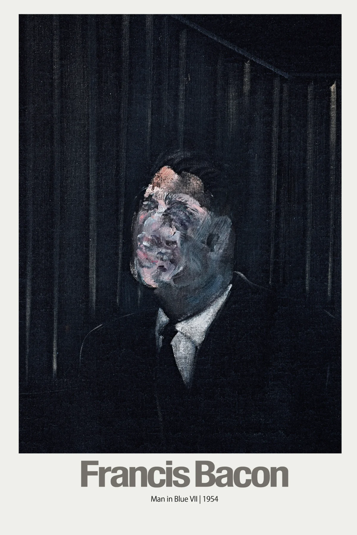Immerse your space in the dramatic, expressionistic world of Francis Bacon with this striking reproduction of Man in Blue VII (1954). This painting is a powerful example of Bacon’s haunting portraiture, featuring a figure in a dark suit against a shadowy, caged background, their face blurred and distorted. This poster captures the intense mood and textured brushwork that defines one of the 20th century’s most important abstract artists. It is an essential piece of wall art for collectors and those who appreciate profound, unsettling modern art.
