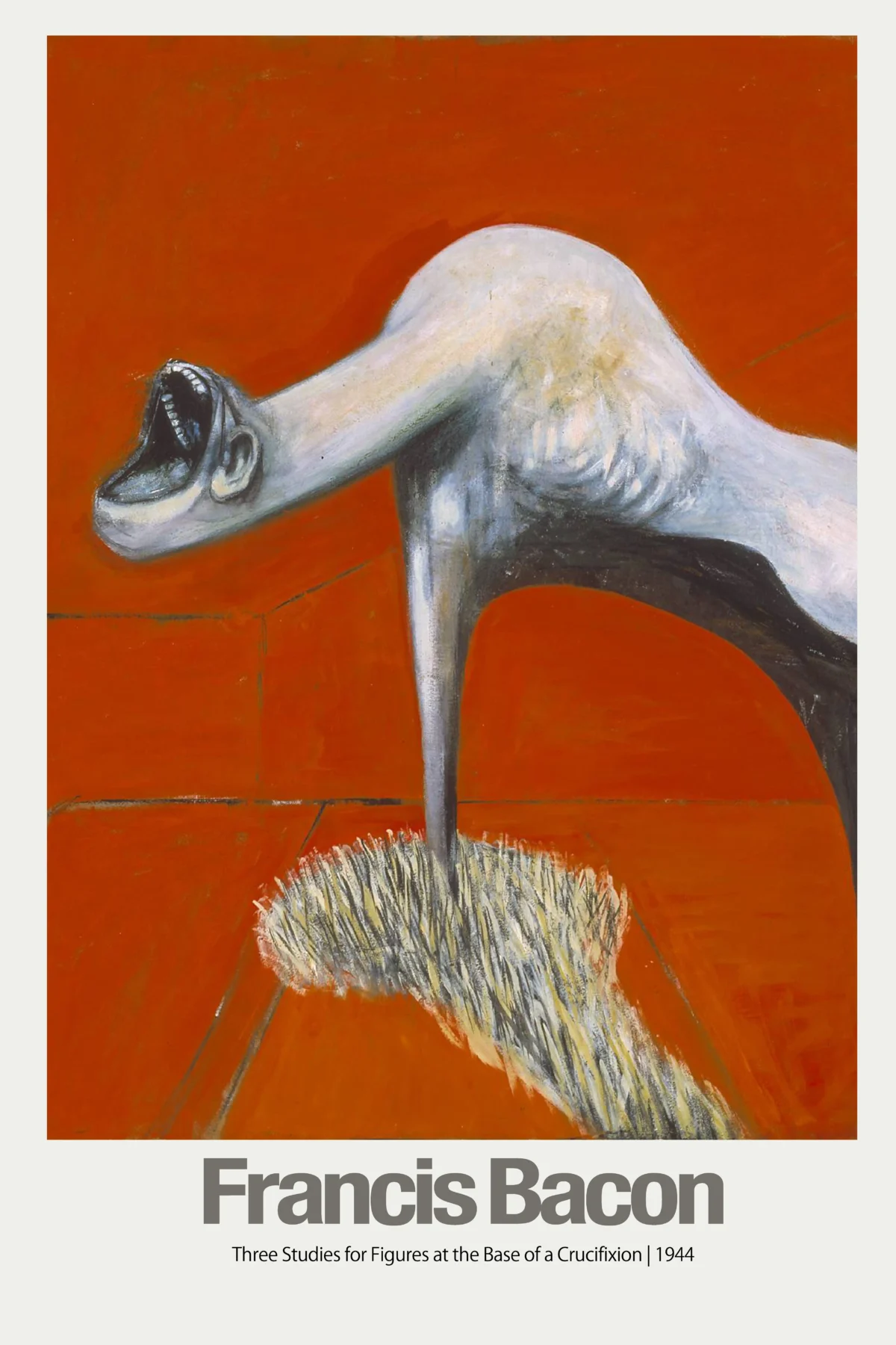 Celebrate the intensity of modern art with this powerful poster featuring a detail from Francis Bacon’s iconic 1944 triptych, ‘Three Studies for Figures at the Base of a Crucifixion’. This piece is recognized as a defining work of post-war expressionism, capturing profound human anguish and transformation. The image focuses on the elongated, screaming figure, rendered with Bacon’s characteristic raw energy and placed starkly against a searing, fiery orange and red backdrop. This print is essential for serious collectors and admirers of 20th-century modernism.