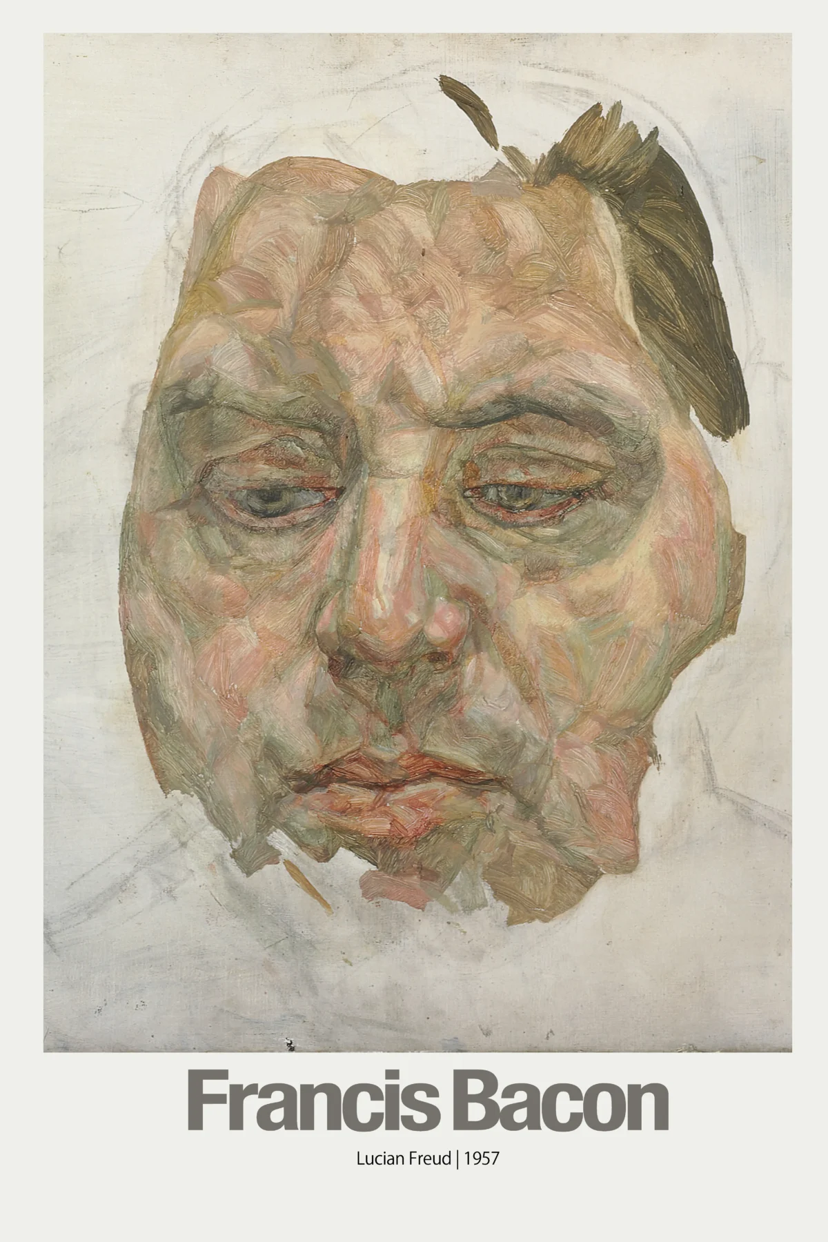 Celebrate the intensity of Post-War British art with this stunning print of Lucian Freud’s famous 1957 ‘Portrait of Francis Bacon’. This iconic piece captures the deep, complex relationship between two monumental figures in 20th-century painting. The original work is renowned for its visceral, textural quality, employing thick impasto to convey raw psychological depth. This poster highlights the expressive brushwork and melancholic color palette, making it a compelling focal point for any sophisticated wall decor collection.