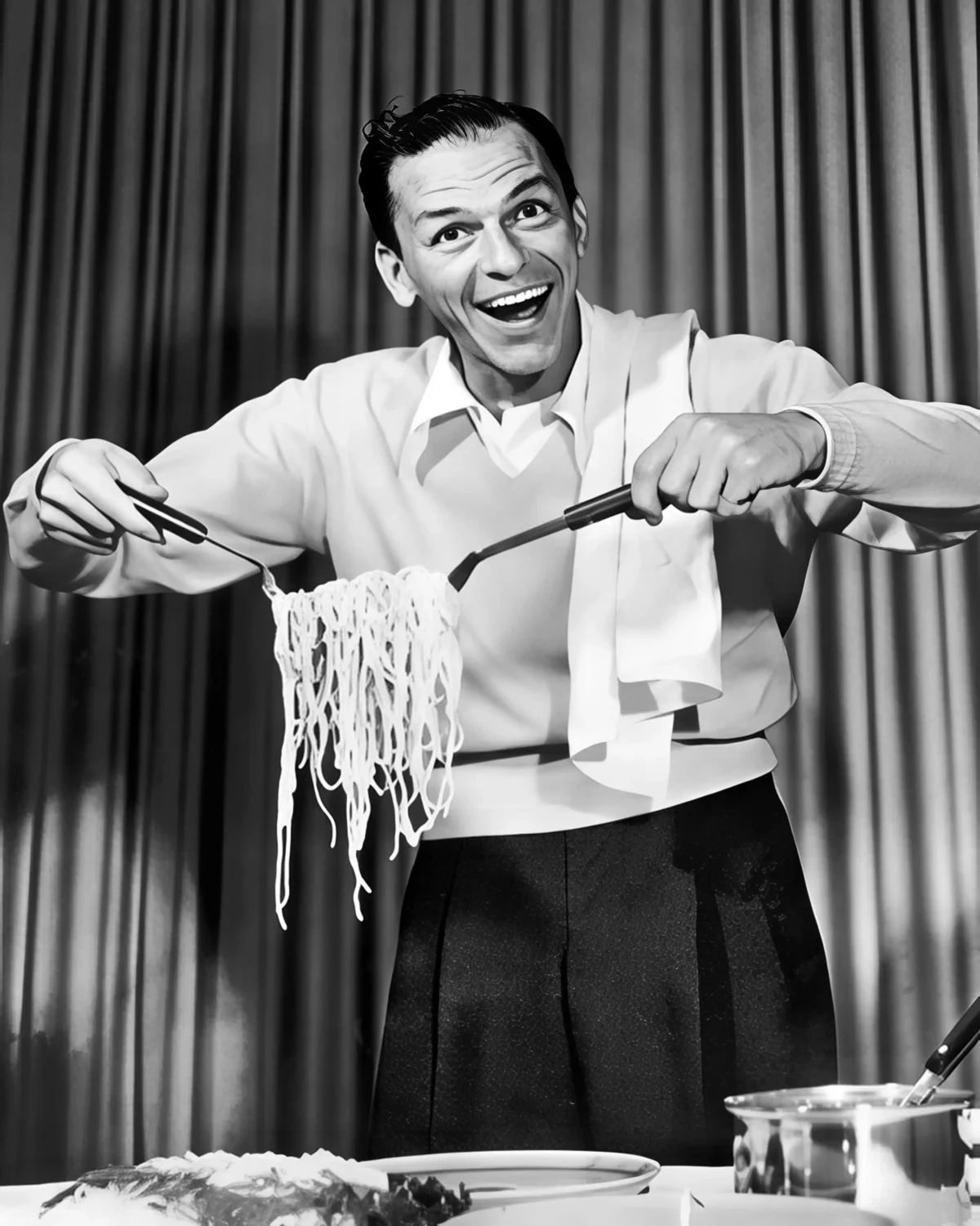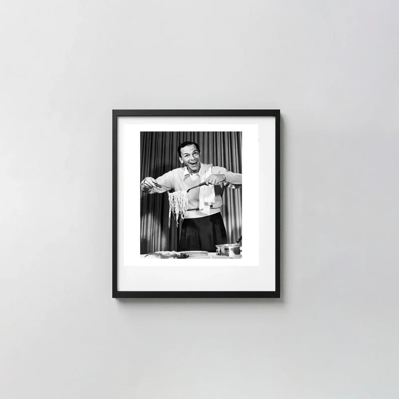 Sinatra’s connection to Italian-American food culture was well documented throughout his life. He was famously devoted to his mother Dolly’s cooking, and pasta was a constant — on tour, between takes, and at the dinner table. A photograph of Sinatra eating spaghetti isn’t a novelty; it’s a piece of cultural biography. As kitchen black and white wall art, this Frank Sinatra spaghetti print sits in a tradition of celebrity food photography that combines the intimacy of the domestic with the mystique of the famous — a tradition that never dates because the image content never loses its meaning.