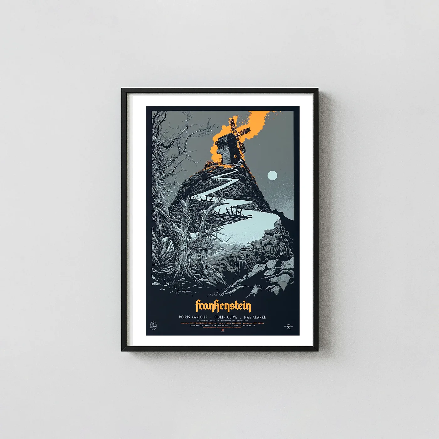 Immortalize the definitive Universal monster classic with this striking Frankenstein poster by Ken Taylor (Mondo, 2014). Featuring the iconic burning windmill scene.