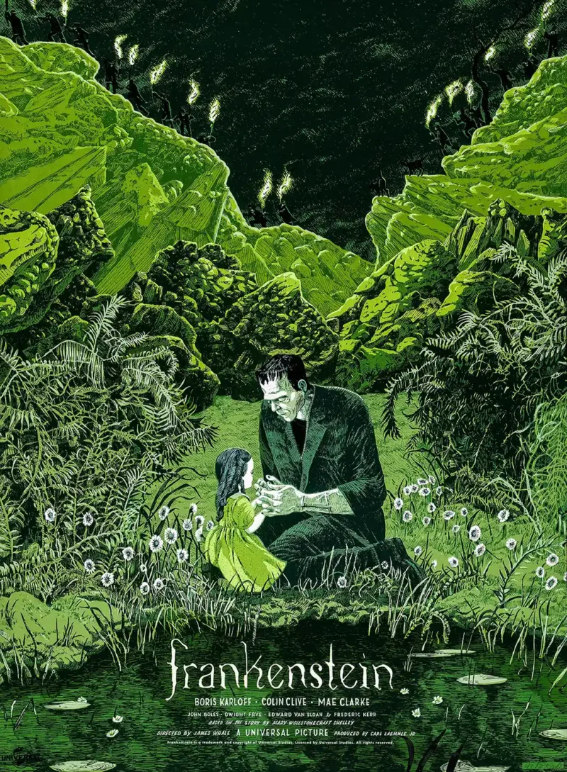 Capture the emotional centerpiece of the 1931 masterpiece, Frankenstein, with this breathtaking art print. This highly sought-after design isolates the most poignant, and ultimately devastating, moment from the film: the innocent encounter between the lonely Monster, played by the legendary Boris Karloff, and the child Maria. Rendered in a stunning, highly detailed illustration style reminiscent of high-end screen prints, this poster utilizes a vivid palette of deep greens and brilliant lime highlights, making the surrounding wilderness feel alive yet ominous.