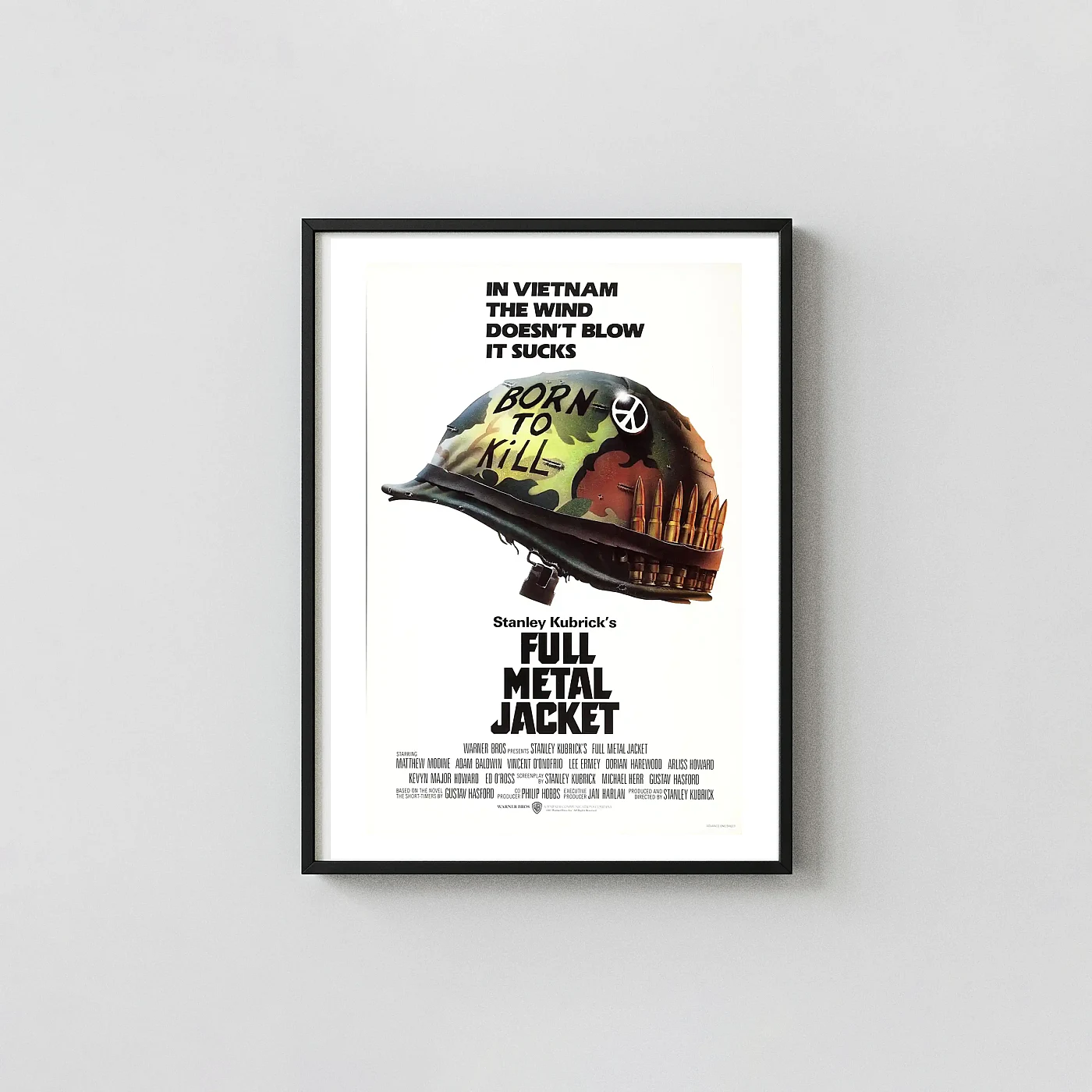 This poster captures the defining visual paradox of Stanley Kubrick’s masterful war film, Full Metal Jacket. Featuring the now-legendary combat helmet emblazoned with the contradictory message “BORN TO KILL” alongside a pacifist peace symbol, this graphic is a powerful statement on the duality of man and the dehumanizing nature of the Vietnam War. This wall art is a faithful reproduction of the original theatrical release poster, making it a must-have piece of cinema history for collectors and fans of classic movies.