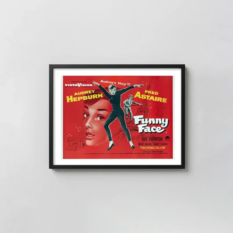 Capture the iconic style of the 1957 film with this Funny Face Movie Poster featuring Audrey Hepburn. Premium quality wall art print perfect for classic cinema fans.