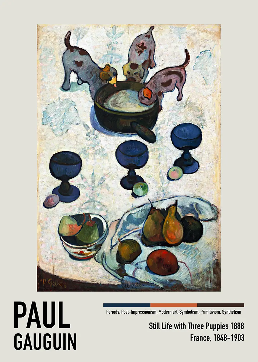 The Gauguin Puppies Poster represents a significant departure from traditional naturalism, marking a pivotal moment in art history. Painted in 1888 during the artist’s stay in Brittany, this work illustrates the shift toward Synthetism, where the artist prioritizes emotional expression and two-dimensional patterns over realistic perspective. The central focus of three small, spotted canines huddled around a dark pan of milk creates a domestic yet avant-garde scene that challenged the conventions of the late 19th century.