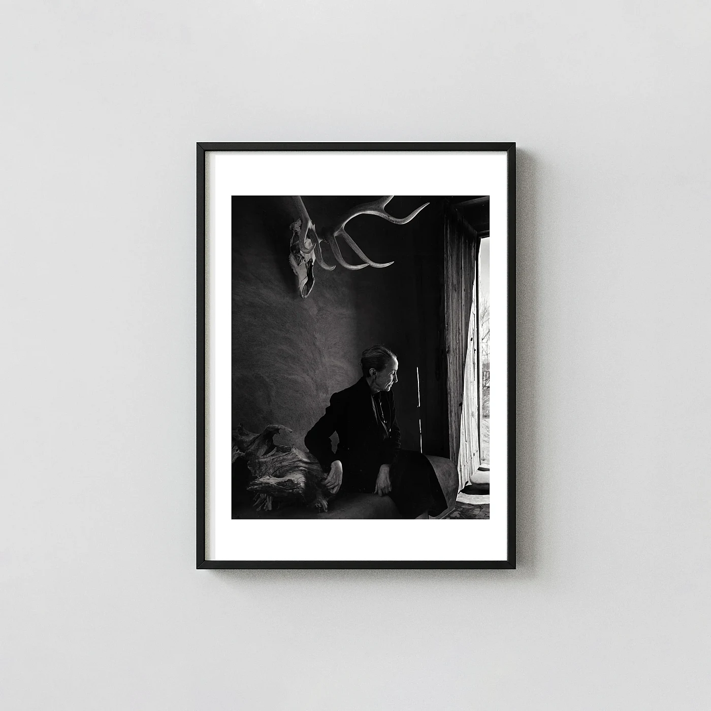 The deep blacks and cool neutrals in this black and white photography print make it a strong fit for a home office with dark shelving or a cream-walled reading room. It works well as a standalone large-format piece above a desk or sideboard. Group it with other vintage portrait photography print selections — other Karsh subjects, other 1950s photographic portraits — for a gallery wall with real coherence.