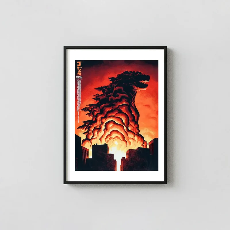 Unlike traditional film marketing, Phantom City Creative utilized a bold, limited color palette—dominated by deep reds, oranges, and stark blacks—to evoke a feeling of absolute terror and impending doom. The detail in the billowing smoke, which forms the spine and menacing snout of the creature, is truly exceptional. This print is not just a poster; it is a powerful piece of visual storytelling, honoring the legacy of the King of the Monsters while defining the tone of the modern Monsterverse era. The dynamic composition and use of negative space make this a standout piece of modern cinematic art.