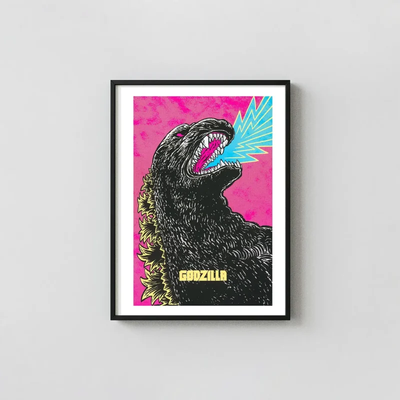 Capture the King of the Monsters with this vibrant Godzilla poster by acclaimed artist Yuko Shimizu. Features neon pink, black, and blue tones, capturing the raw power of the atomic breath. Perfect for Kaiju fans and Mondo collectors!