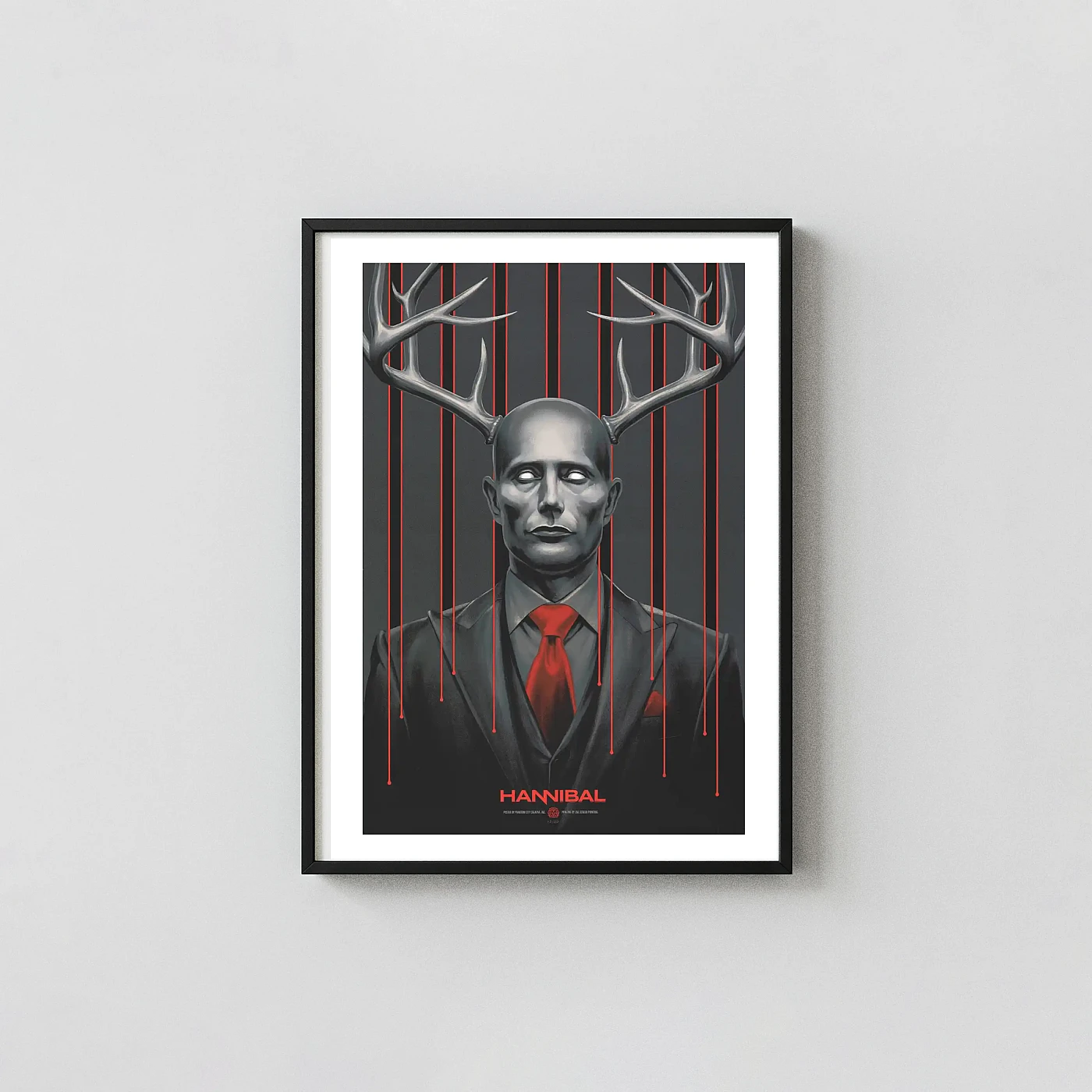 Own the dark elegance of the Hannibal TV series with this stunning Phantom City Creative Mondo poster. Featuring the iconic Stag Man motif and chilling red accents. Perfect for Fannibals.