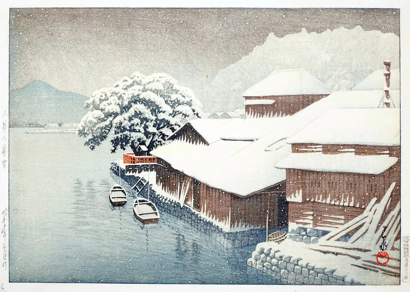 Within this Hasui Kawase print, the viewer finds a sophisticated use of the bokashi technique, where ink is hand-wiped from the woodblock to create soft, smoky gradations in the sky and water. The palette is dominated by indigo, slate grey, and charcoal, punctuated only by a sharp dash of vermilion on a small railing near a snow-laden tree. This single pop of color draws the eye through the frame, providing a focal point amidst the monochromatic winter chill. The falling snow is rendered through unprinted white space, creating a sense of texture and motion that feels tactile and immediate. Every snowflake is strategically placed to enhance the sense of perspective and atmospheric density.