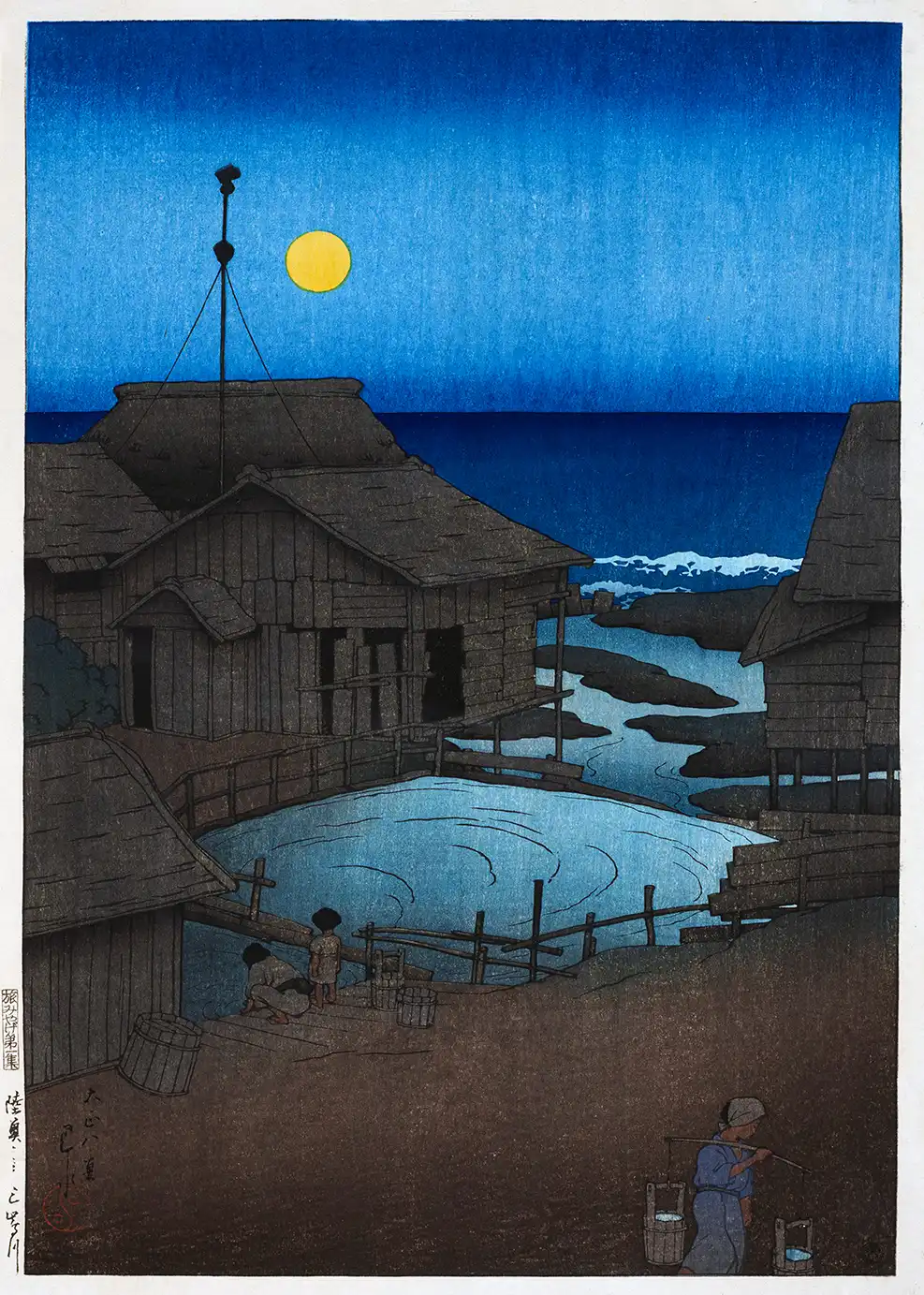 The Shin-hanga movement, or ‘new prints,’ sought to revitalize traditional ukiyo-e techniques by incorporating Western elements of light and perspective. In this specific Hasui Kawase print, the artist employs a complex layering of blue pigments to suggest the onset of night. The figures in the foreground, carrying water buckets on a yoke, emphasize the quiet labor that characterized rural life during this period. The reflection of the moon in the calm water basin creates a visual anchor that draws the eye toward the center of the frame. The contrast between the dark silhouettes of the fishing huts and the luminous water creates a sense of depth that was revolutionary for the time.