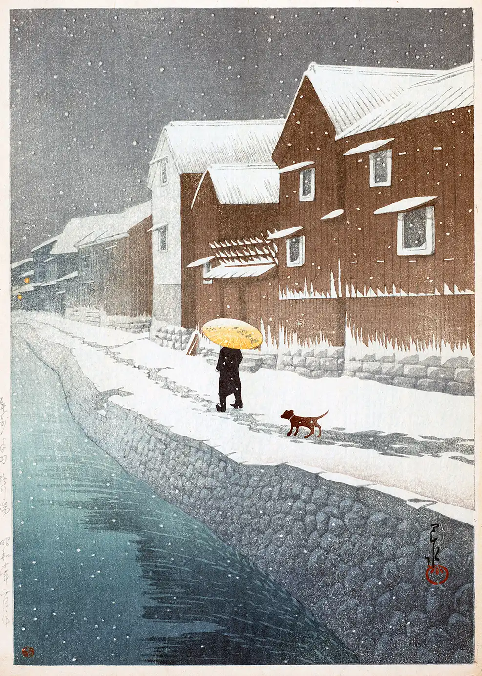 This Hasui Kawase Print captures the quietude of a winter evening in the Owari Province, specifically the canal-side Shinkawabata district of Handa. Produced originally in 1935 during the height of the Shin-hanga movement, this artwork exemplifies the technical precision and emotional depth characteristic of the era. The composition focuses on the architectural rhythm of traditional wooden storehouses, their deep brown facades providing a stark vertical contrast to the soft white accumulation of snow on rooftops and along the canal edge. The presence of a lone figure carrying a vibrant yellow umbrella provides a central focal point, while the inclusion of a small dog following closely behind adds a narrative layer to the otherwise silent environment.
