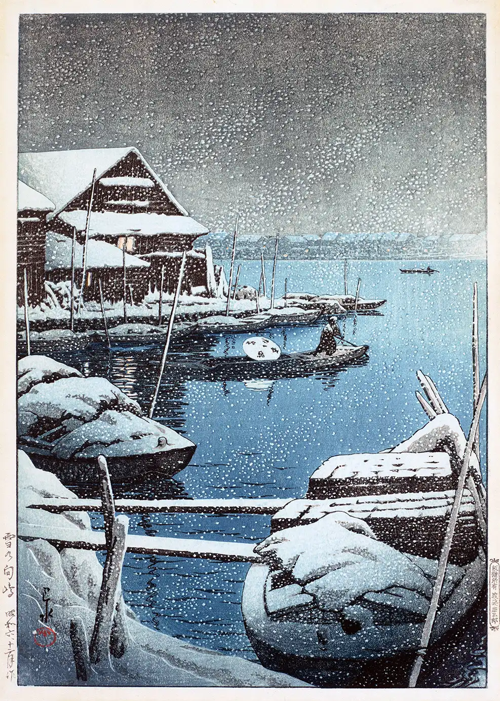 The Hasui Mukojima Print is a definitive example of the Shin-hanga movement, capturing the quietude of a Tokyo winter in 1931. Created by the renowned artist Hasui Kawase, this work focuses on the Mukojima district, a region famous for its scenic views along the Sumida River. The composition features a foreground dominated by snow-laden wooden boats, their dark hulls providing a sharp contrast against the pristine white accumulation. In the midground, a lone figure navigates a small skiff through the icy blue water, while a warm light flickers from the window of a traditional wooden house on the shore. The sky is a dense, textured grey, filled with the constant motion of falling snow depicted through meticulous white dotting techniques common in high-end woodblock production.