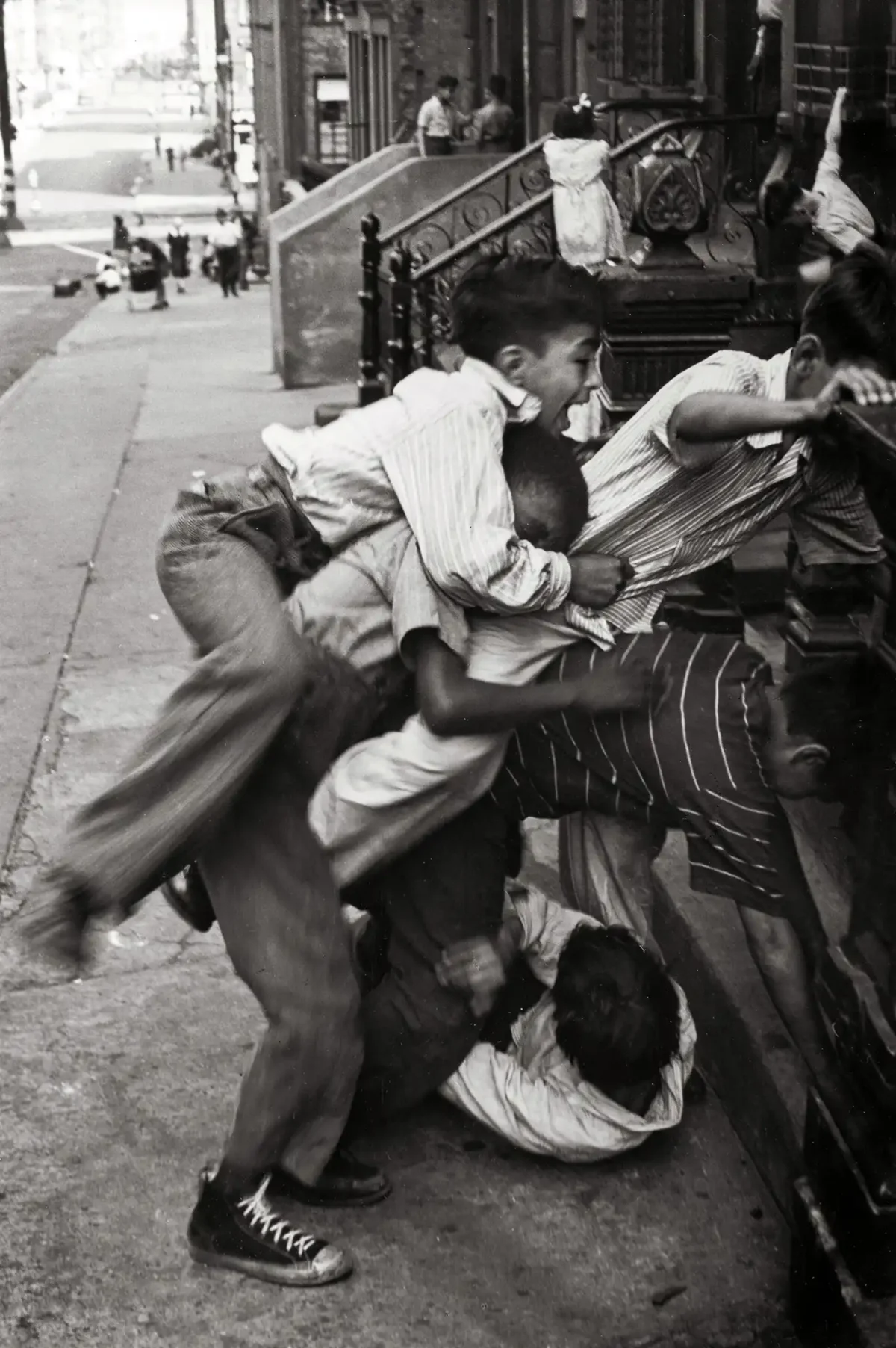 This striking black and white photography poster captures the unfiltered energy and joy of mid-century urban childhood, characteristic of legendary American photographer Helen Levitt. Known as the “most celebrated and least known photographer of her time,” Levitt masterfully documented the spontaneous theater of the street, particularly focusing on the spirited games and interactions of children in working-class New York neighborhoods. This specific print showcases a dynamic moment of boys wrestling or engaging in exuberant play on a city stoop, bringing a powerful, nostalgic, and authentic slice of history to your wall art collection.