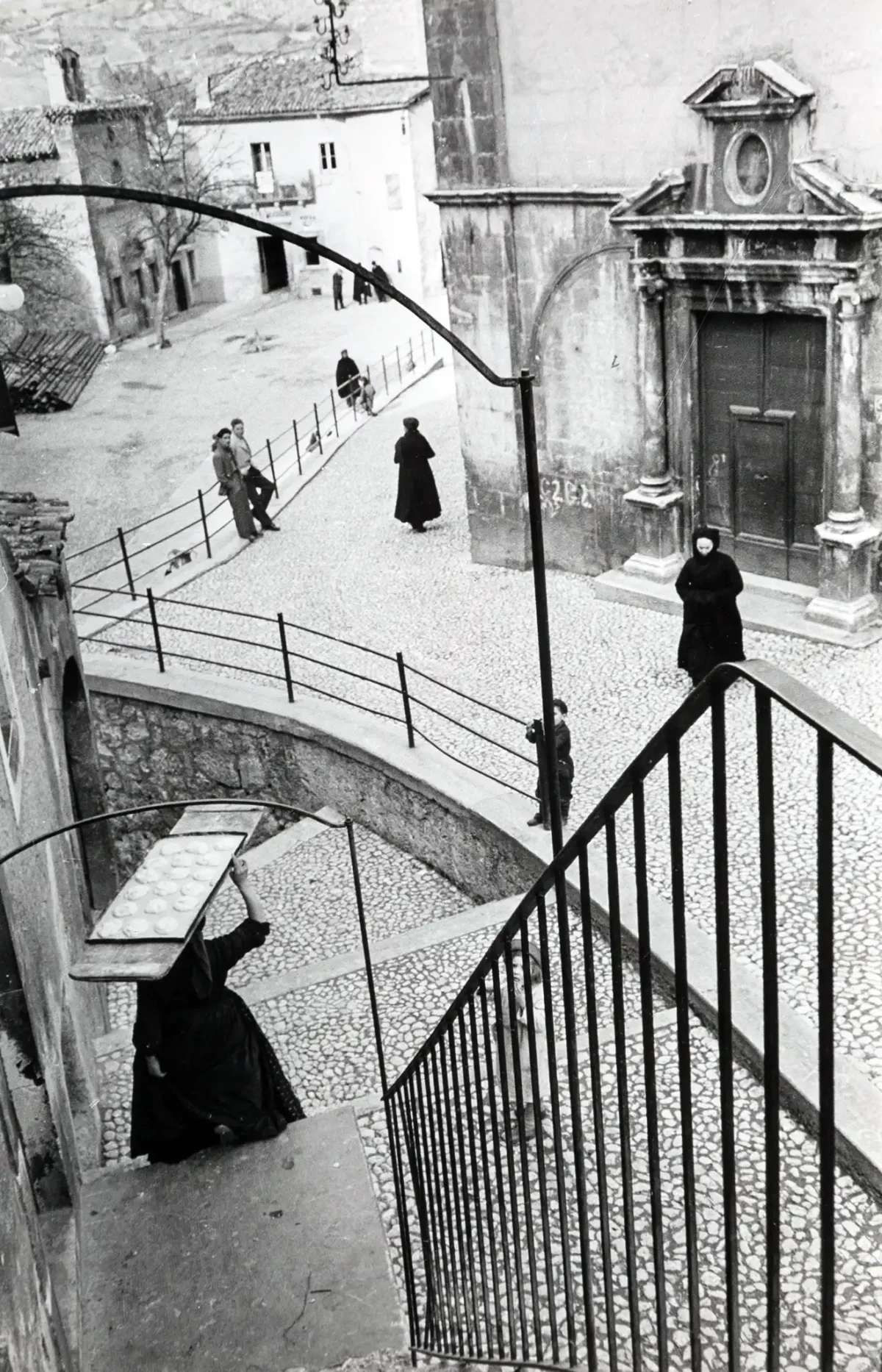 Capture the geometric genius of the master of candid photography with this iconic Henri Cartier-Bresson poster, famously captured in Sicily, Italy, in 1947. This image perfectly encapsulates Bresson’s concept of the “Decisive Moment,” featuring a dynamic composition of railings, cobblestone textures, and figures frozen in time. The striking contrast between the dark figures and the bright, textured architecture creates a profound sense of depth and mystery, highlighted by the central figure descending the steps while expertly balancing a tray overhead.
