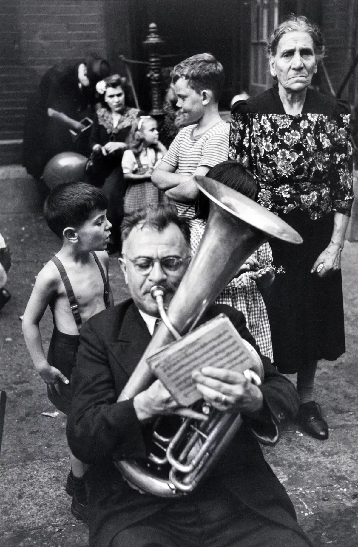 Capture the essence of 20th-century photojournalism with this iconic Henri Cartier-Bresson poster, titled ‘Palermo, Sicily.’ This stunning black and white image perfectly exemplifies Cartier-Bresson’s legendary mastery of “The Decisive Moment,” freezing a raw, spontaneous street performance. The composition is compelling, featuring a seated musician playing a brass instrument, surrounded by observers—from an intense, shirtless boy in suspenders to the stern, watchful gaze of an elderly woman. It is a powerful study of human interaction, performance, and the simple drama of daily life, making it a timeless piece of wall art for any connoisseur of classic photography.