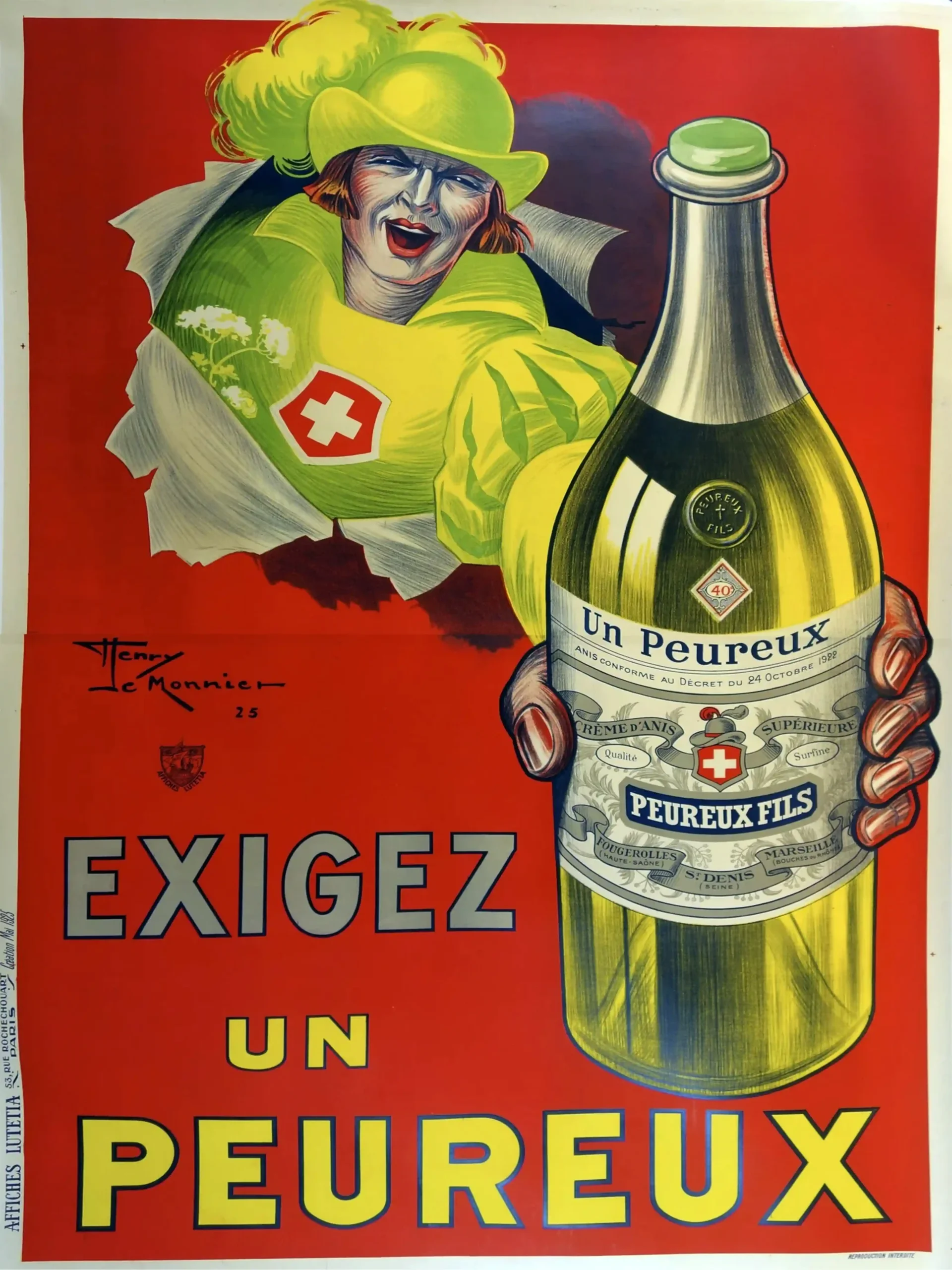 Celebrate 1920s French advertising with this striking Henry Le Monnier poster for ‘Un Peureux’ Crème d’Anis. Vivid colors, Art Deco style, and historical beverage art.