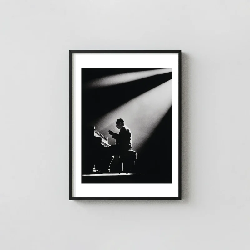 This Herman Leonard print documents Duke Ellington in Paris in 1958 — a city where Ellington had been received as a giant since his first European tour, and where Leonard himself spent much of his career photographing American jazz musicians who found in Paris an audience and a freedom they couldn’t always find at home. Leonard’s jazz photography art was built on access, patience, and the understanding that the best jazz photograph is made between the notes, not during them. This Duke Ellington photo print is black and white jazz print work made by a photographer who was as much a part of the jazz world as the musicians he documented. This Herman Leonard print is vintage music photo of the highest order.