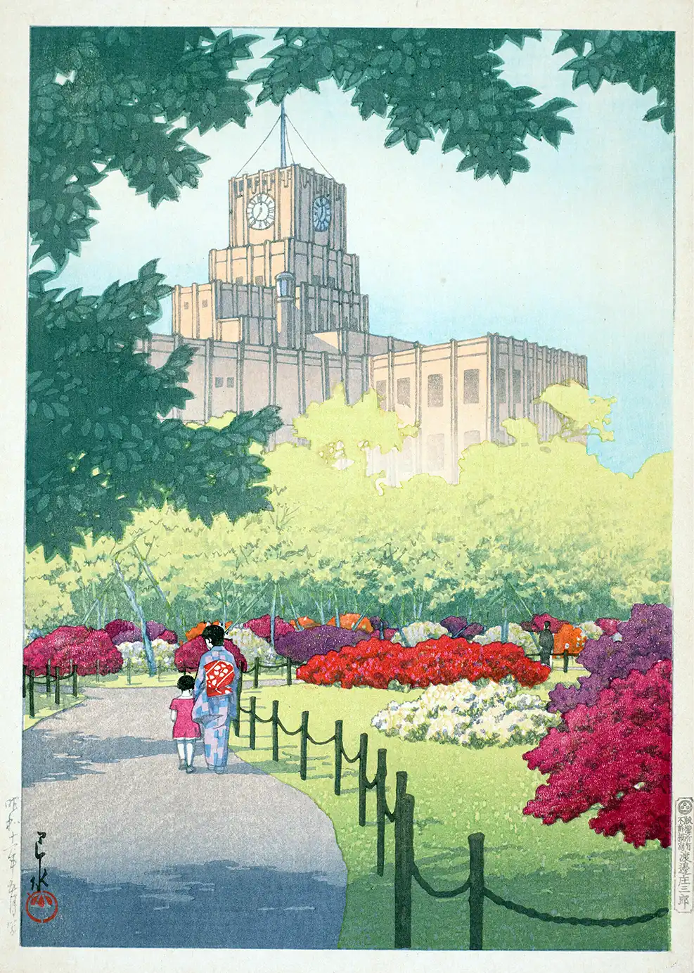 This Hibiya Park Print captures the serene 1936 spring landscape of Tokyo with vibrant azaleas and a towering clock face. This Shin-hanga woodblock reproduction is printed on 200 GSM museum-grade matte paper.