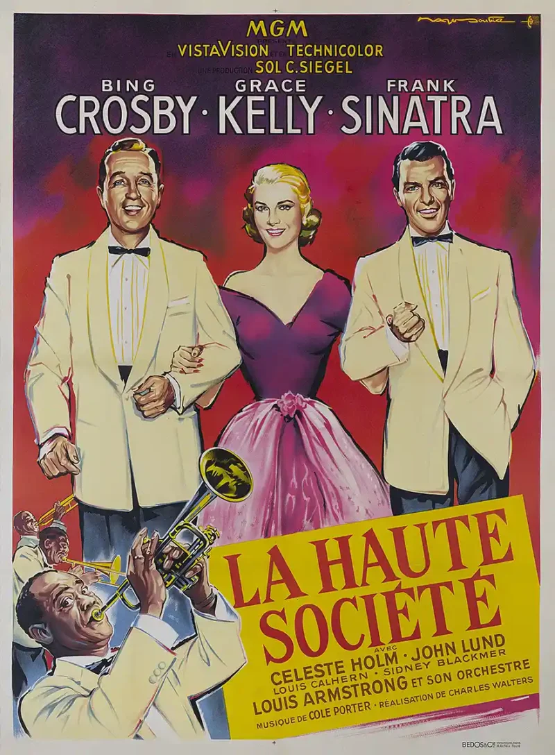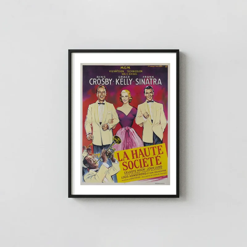 Celebrate the timeless glamour of the 1956 musical masterpiece, High Society. This stunning vintage poster features the iconic cast trio: the radiant Grace Kelly, accompanied by legends Bing Crosby and Frank Sinatra, all dressed in elegant formal wear. Below them, jazz master Louis Armstrong sets the scene. This artwork, featuring the French title “La Haute Société,” captures the sophisticated, mid-century charm and dazzling soundtrack composed by Cole Porter. It’s a perfect piece of cinematic history and Hollywood nostalgia.