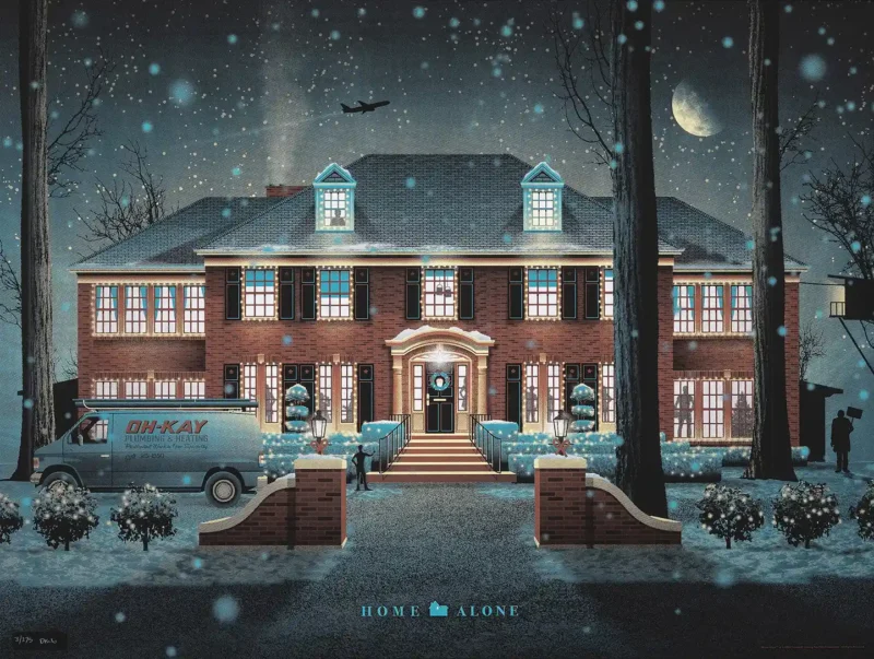This detailed illustration is a must-have for any true cinephile or art collector. Notice the subtle narrative elements woven into the image: the tell-tale “Oh-Kay Plumbing & Heating” van parked strategically near the entrance, signaling the impending arrival of Harry and Marv (the Wet Bandits). If you look closely at the upper windows, you can spot the silhouette of little Kevin, ensuring the illusion of a full house is maintained while he prepares his notorious booby traps. The stark contrast between the holiday cheer and the lurking threat makes this poster a fascinating and sophisticated tribute to the beloved 1990 film. Hang this piece in your living room or media area to capture the spirit of Christmas—and the spirit of mischievous independence.