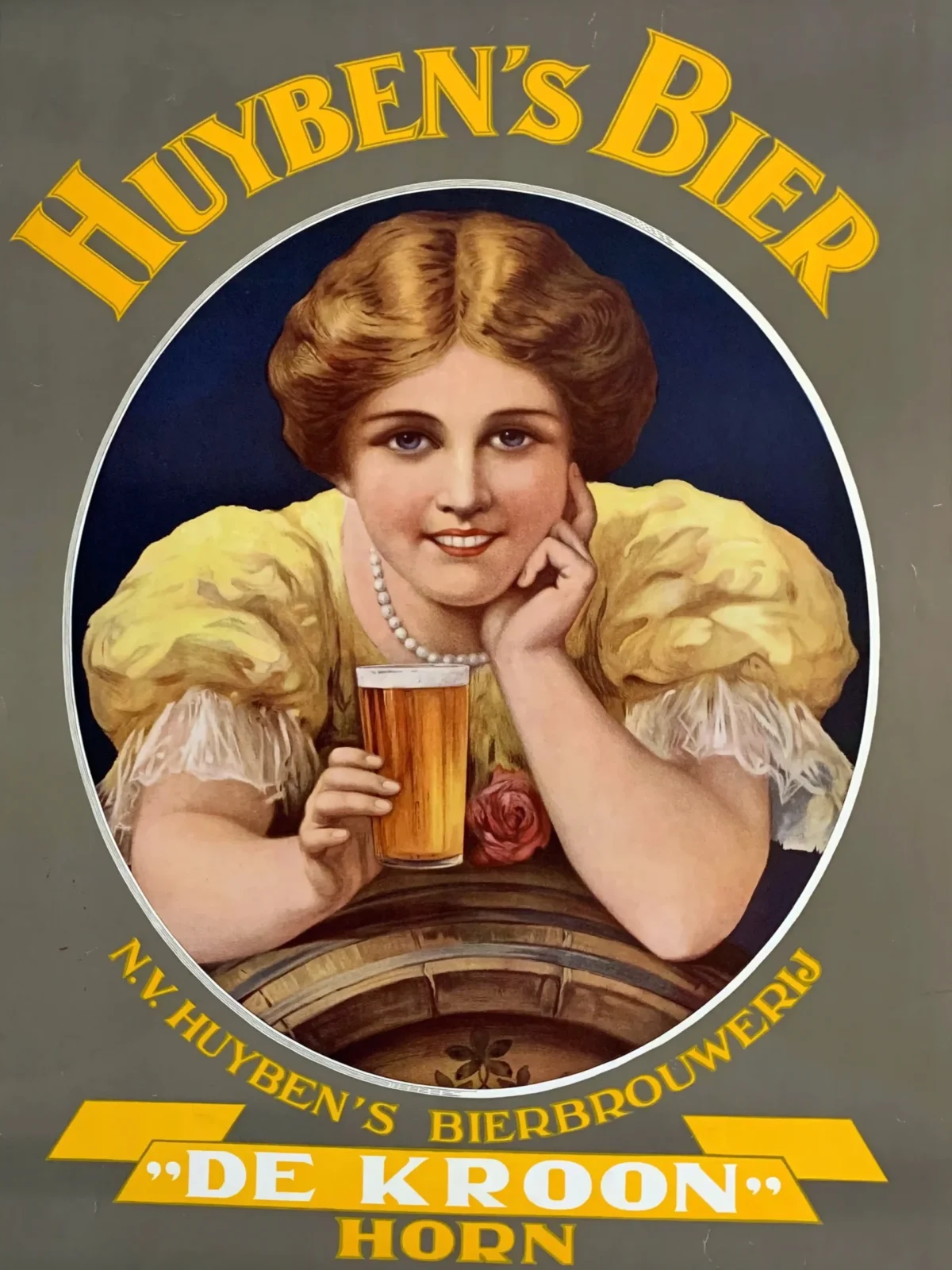 Stunning vintage poster for Huyben’s Bier, featuring a smiling woman with a pint of beer. Authentic Dutch brewery art from “De Kroon” Horn. Perfect for bar decor or retro advertising collectors.