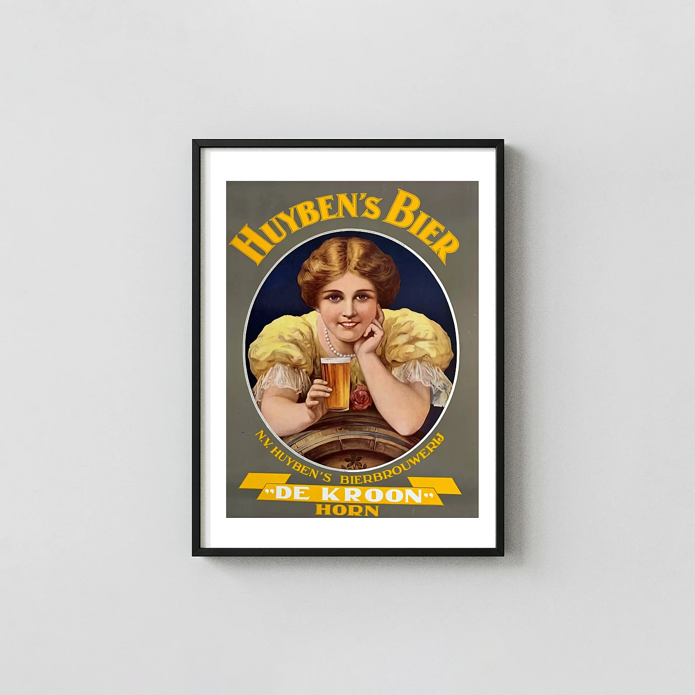 Step back into the golden age of advertising with this exquisite reproduction poster for Huyben’s Bier. This magnificent vintage piece showcases the classic appeal used by N.V. Huyben’s Bierbrouwerij “De Kroon” located in Horn, Netherlands. The artwork features a charming, elegantly dressed woman—likely representing the ideal consumer or the spirit of the brewery—holding a perfect glass of golden lager. She rests her arm on a wooden beer barrel, offering a welcoming smile that epitomizes the friendly nature of early 20th-century Dutch advertising.