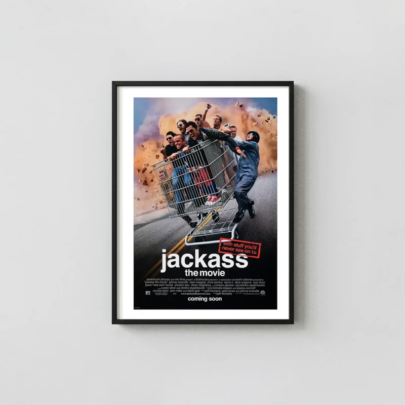 Get the iconic Jackass: The Movie poster featuring Johnny Knoxville and the crew in their chaotic shopping cart stunt. Premium quality wall art. Perfect gift for fans!