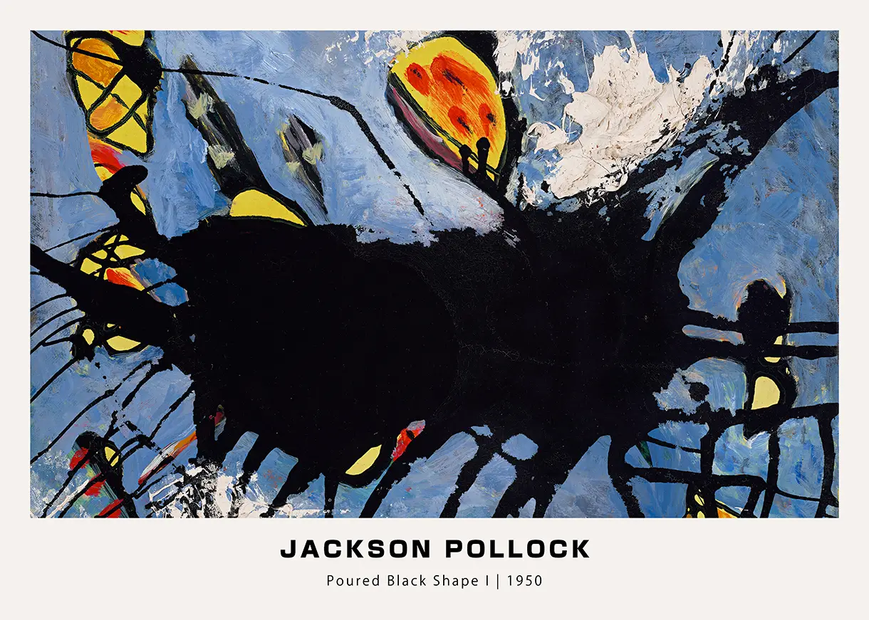 This Jackson Pollock print captures the raw, energetic essence of the 1950s New York school of abstract expressionism. Poured Black Shape I, originally created in 1950, stands as a pivotal example of the drip and pour technique that defined a generation of American art. The composition is anchored by a massive, central black form that appears to have been physically cast onto the surface, creating a sense of weight and motion that static brushwork rarely achieves. Surrounding this dominant shape is a field of cerulean and sky blue, applied with visible, gestural strokes that provide a cool-toned counterpoint to the deep black ink.