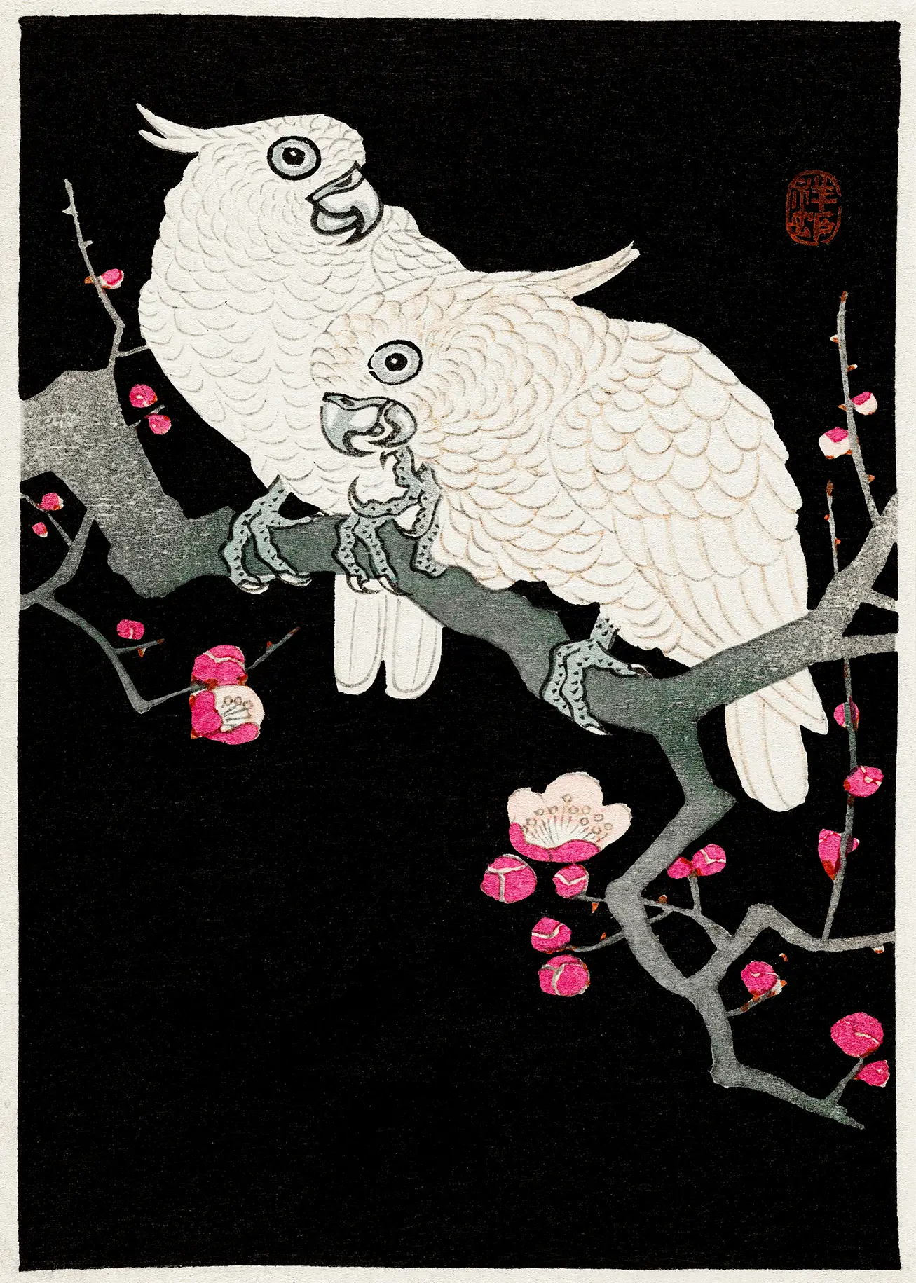 The Japanese cockatoo print belongs to the Shin-hanga movement, a period that revitalized traditional woodblock printing techniques by integrating Western elements like light and individual expression. Unlike earlier ukiyo-e prints, these works emphasized the realism of the subject. The artist utilized the texture of the woodblock to simulate the soft down of the birds’ plumage, creating a tactile quality that remains evident in this high-resolution reproduction. The red artist seal in the upper right corner serves as a mark of authenticity to the original design, anchoring the visual balance of the frame.