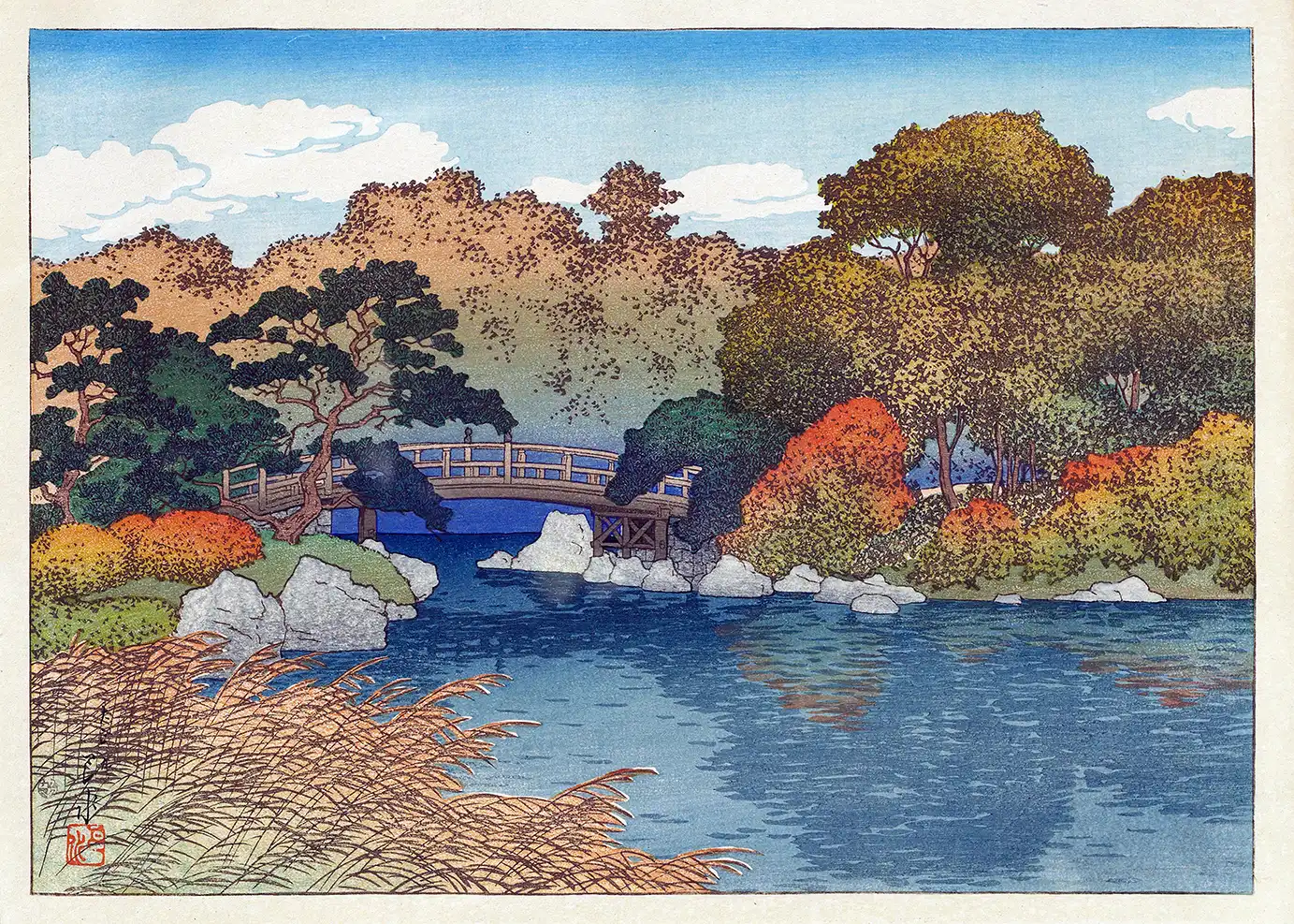 The **Japanese Woodblock Autumn Print** serves as a definitive representation of the Shin-hanga movement, which flourished during the early twentieth century. This artistic genre sought to revitalize the traditional ukiyo-e woodcutting craft by incorporating Western elements of perspective and light while maintaining the distinct hand-carved textures of the East. In this particular scene, the viewer is presented with a serene garden environment where a wooden arched bridge spans a still pond. The water is rendered in a deep, saturated blue, creating a cool anchor for the composition that effectively highlights the warmer tones of the surrounding foliage. Every element, from the jagged rock formations along the bank to the delicate reeds in the foreground, reflects a commitment to naturalistic detail and spatial harmony.