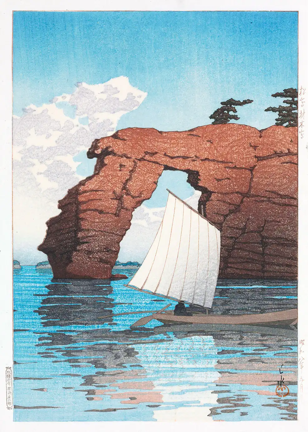 This Japanese woodblock print captures the atmospheric calm of Zaimoku Island, a renowned geological feature within the Matsushima Bay area of Miyagi Prefecture. Created in 1933 by the artist Shiro Kasamatsu, this work represents the peak of the Shin-hanga movement, which sought to revitalize the traditional ukiyo-e style by incorporating Western perspectives on light, shadow, and depth while maintaining the heritage of manual wood carving and hand-pressed ink application. The composition focuses on a massive, reddish-brown rock formation that has been hollowed out by centuries of coastal erosion to form a natural archway. A traditional Japanese sailing vessel with a tall, white-ribbed sail glides past the arch, its form reflected in the rhythmic ripples of the sea below. This specific Japanese woodblock print is a testament to Kasamatsu’s ability to balance architectural stillness with the subtle movement of water and wind.