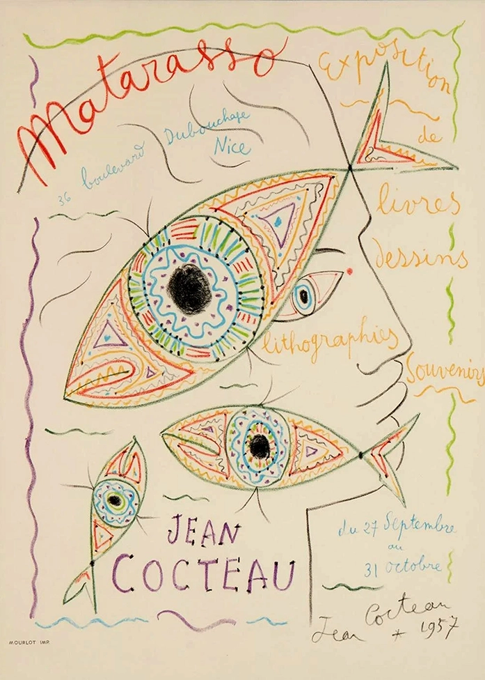 This 1957 graphic work utilizes a vibrant palette of red, yellow, green, and purple, characteristic of the Mediterranean light found in the French Riviera. The Matarasso Nice vintage art style is defined by its whimsical yet deliberate linework. The face, rendered in a single, confident stroke, provides a structural foundation for the more fluid, handwritten text that circles the central figure. The fish eyes are particularly noteworthy, filled with intricate geometric patterns and concentric circles that suggest a deeper, symbolic meaning often found in his cinematic and literary works. This surrealist line art print reflects the artist’s ability to blend mythology with modernism, a trait that defined the 1950s French avant-garde.