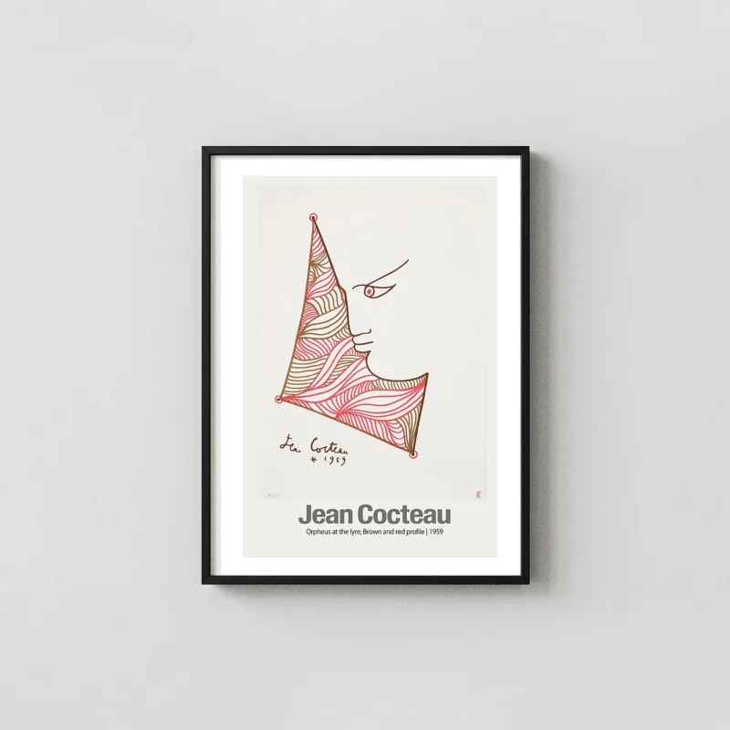 In the narrative of Orpheus, music serves as the bridge between the living world and the underworld. Cocteau was obsessed with this theme, frequently revisiting the Orphic myth in his films and his graphic works. This Jean Cocteau poster highlights that obsession through the literal fusion of the man and his instrument. The red and brown lines within the lyre do not just represent strings; they represent the fluid nature of creativity and the chaotic beauty of the artist’s internal world. By acquiring this Jean Cocteau poster, you are bringing a piece of French cultural history into your space, reflecting a time when art sought to simplify the human experience into its most essential forms.