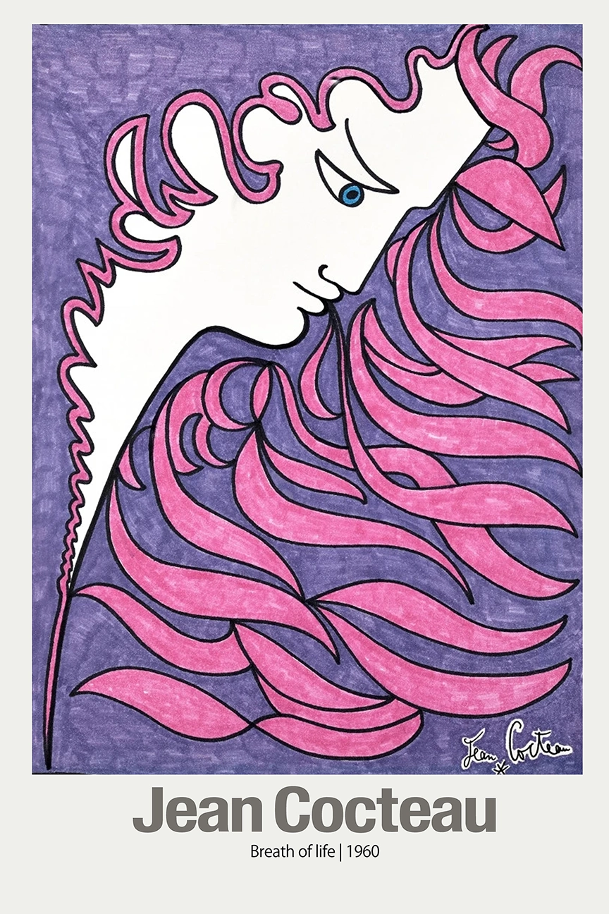 This Jean Cocteau print captures the fluid lines and avant-garde spirit of the late French artist’s work from the 1960s. The piece, titled Breath of Life, showcases a side profile in stark white against a deeply textured purple field. The hair is rendered in vibrant magenta curls that flow across the composition like waves of heat or energy, while a single blue eye anchors the viewer’s attention. This particular reproduction honors the lithographic quality of the original sketch, maintaining the integrity of the black contour lines and the iconic star-signature found in the lower right quadrant.